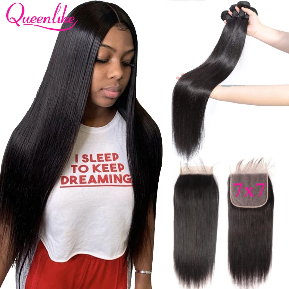 Большие 7x7 закрытие и 3 пряди Remy натуральные кудрявые пучки волос пряди с фронтальной бразильской прямой пряди волос с 7*7 закрытие