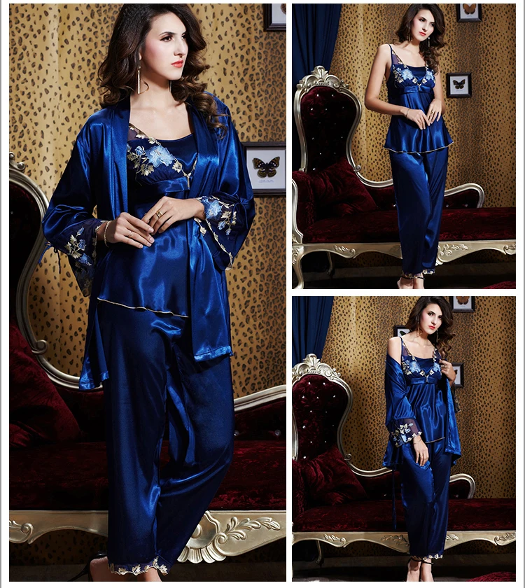 Модель 2017, Женская атласная Шелковая пижама, красный пижамный комплект из трех предметов, кружевная Пижама с вышивкой из искусственного шелка, женские пижамы