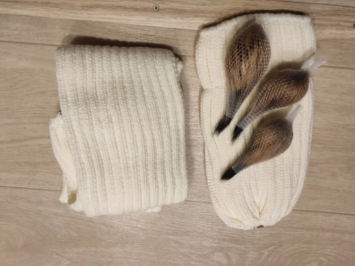 Комплект очень хороший! Но в нашем случае есть минусы: закидывали и рассчитывали получить белый комплект к белому комбинезону, а комплект молочного цвета (видно на фото). На шарфе было пятно, отстирается, но не приятно ( и комплект не зимний, вязка одинарная, нет подкладки на флисе. Упаковано было хорошо, запаха нет.