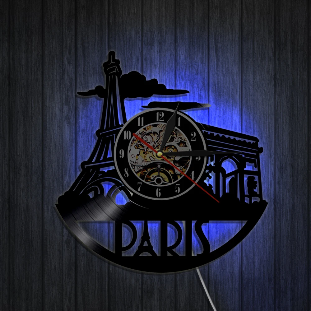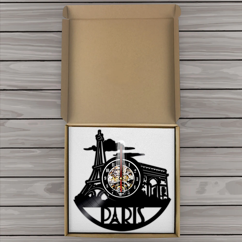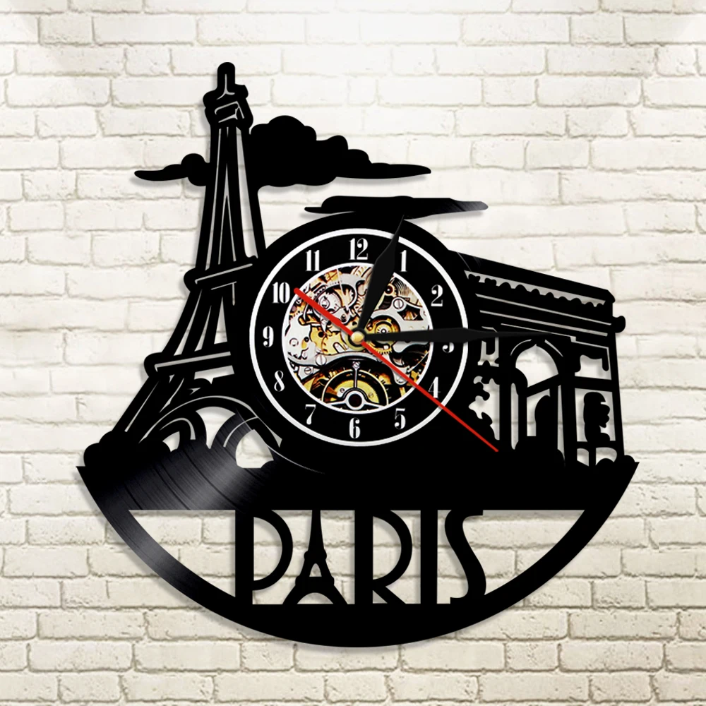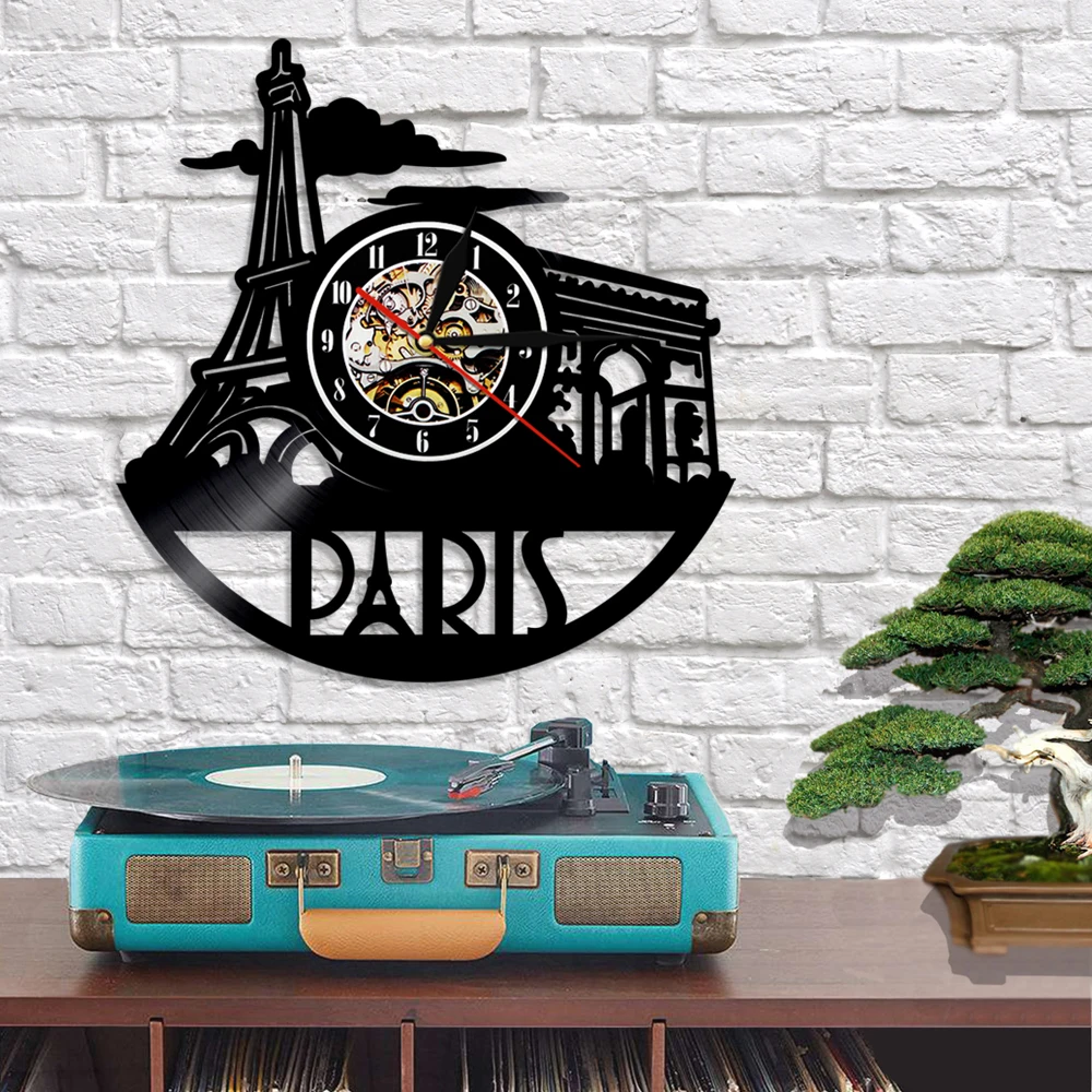 Настенные часы с виниловой пластиной, французский Декор для дома, с изображением французского пейзажа, Эйфелевой башни, достопримечательности, музыкальный альбом, настенные часы