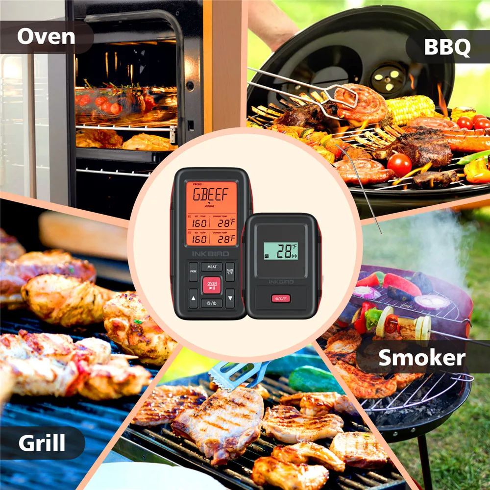 Температурная сигнализация, для приготовления пищи, барбекю, курильщика и многое другое-сигнал до 500 футов/150 мИспользование: беспроводной термометр может использоваться с мясом, барбекю, курильщиком, духовкой или конфетами.