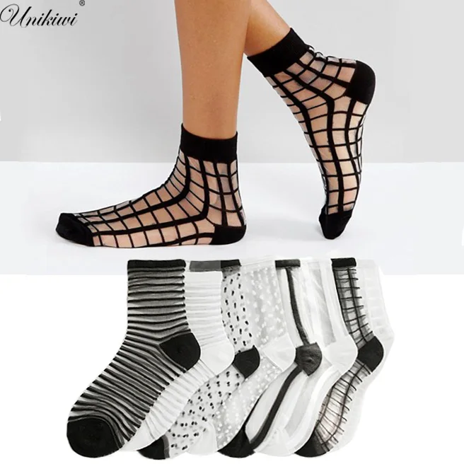 UNIKIWI женские прозрачные носки в черно-белую сетку в полоску. Harajuku женские тонкие шелковые носки в горошек со стразами