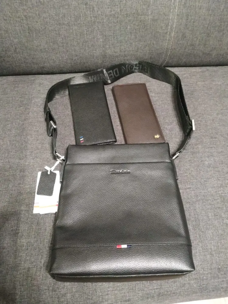 Товар пришел в срок. Без брака, хорошо упакован, полное соответствия описанию. На фото плохо получился цвет из-за освещения, но он однотонный темно-синий. В целом доволен, единственное но это мягкость изделия в целом. Хотелось бы чтобы кошелек был чуть покрепче и держал форму чуть лучше. Советую к покупке)