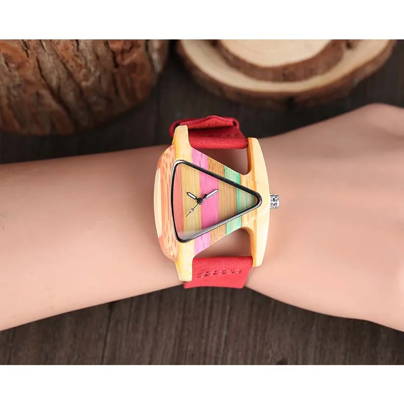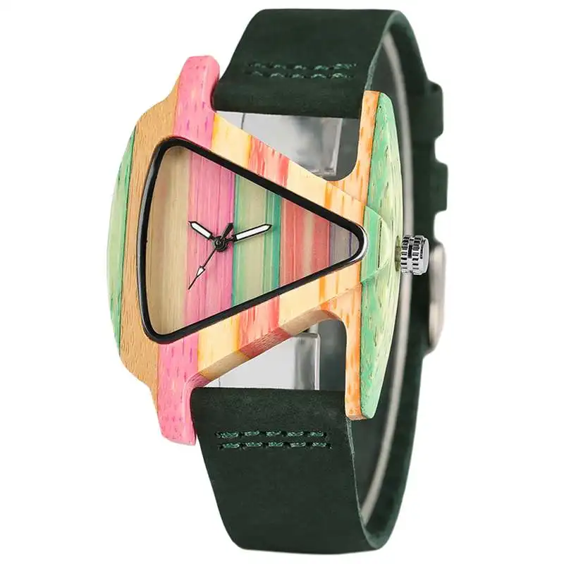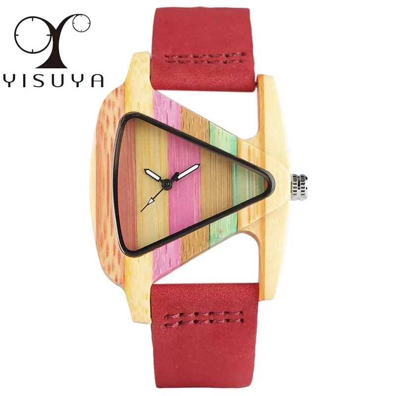 Уникальные треугольные полые деревянные часы YISUYA, креативные Разноцветные полосатые бамбуковые часы, женские часы, кожаные женские наручные часы 2020