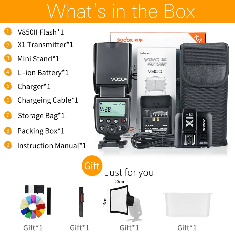 -Godox V850II может достичь 1/8000s высокоскоростных функций синхронизации при использовании в комбинации с высокоскоростными тригерами. e.g. Приемопередатчик Godox Cells II, беспроводной триггер вспышки X1 TTL и т. д.