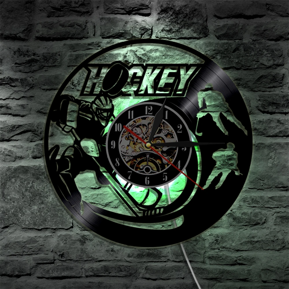 Настенные часы Play винил Хоккей с записью, мерцающий силуэт, настенный светильник светодиодный светодиодная подсветка, настенный светильник, подарок для хоккеиста