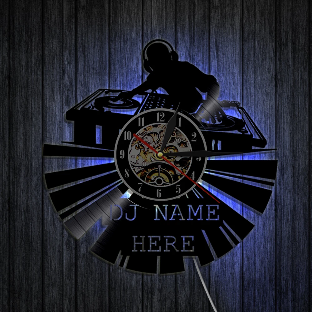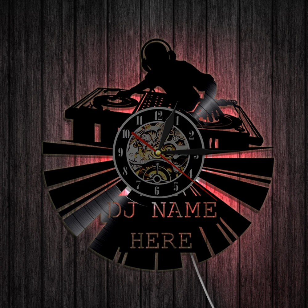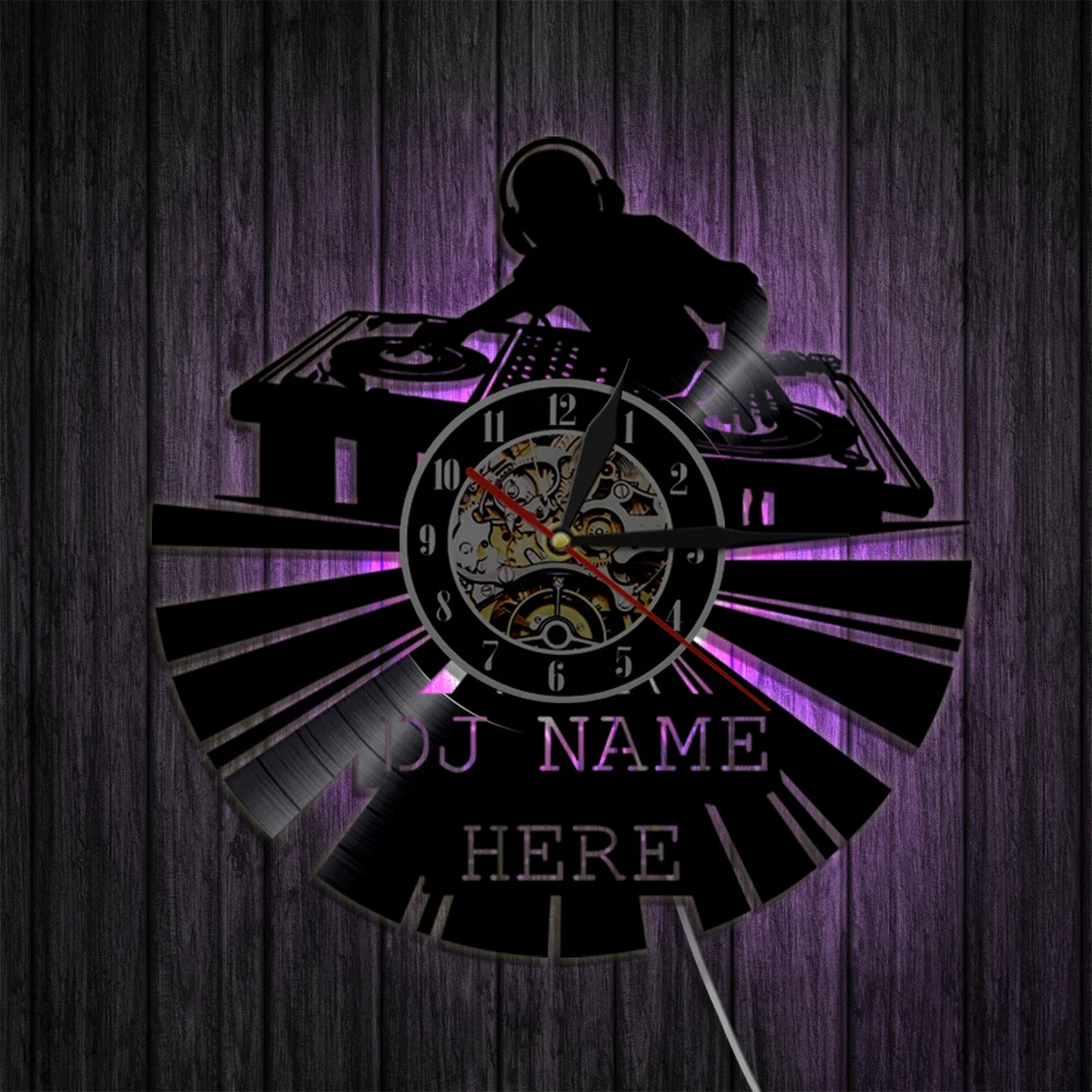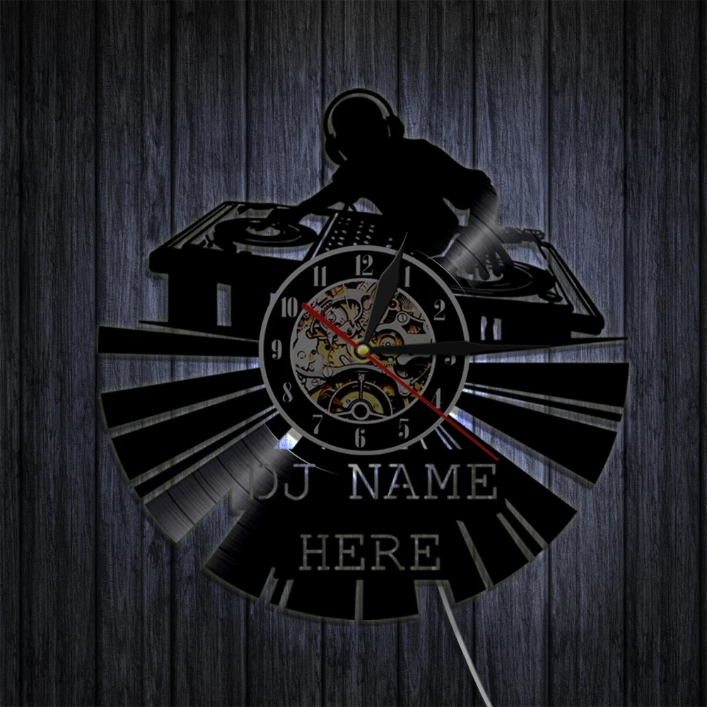 Настенные часы с именем диджея на заказ, винтажные музыкальные, с виниловой пластиной, с именем диджея, настенные часы с персонализированным именем, в стиле Рок н-ролл, музыка в ретро стиле, подарок