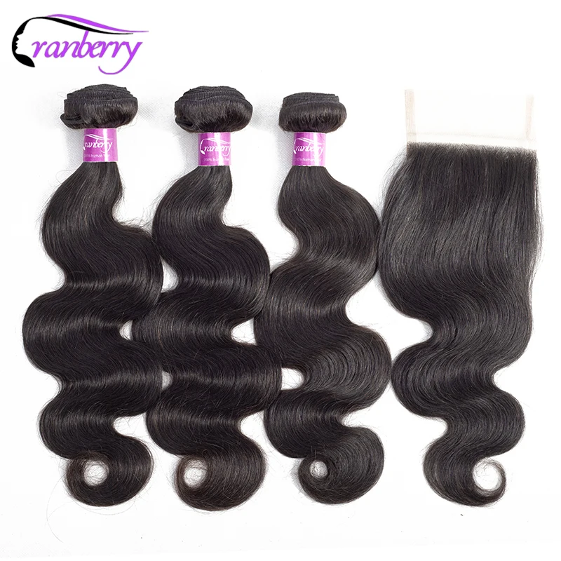 Клюквенные волосы бразильские волнистые пряди для тела с закрытием 100% Человеческие волосы Remy 3 пряди с закрытием швейцарское кружево средней длины коричневое кружево