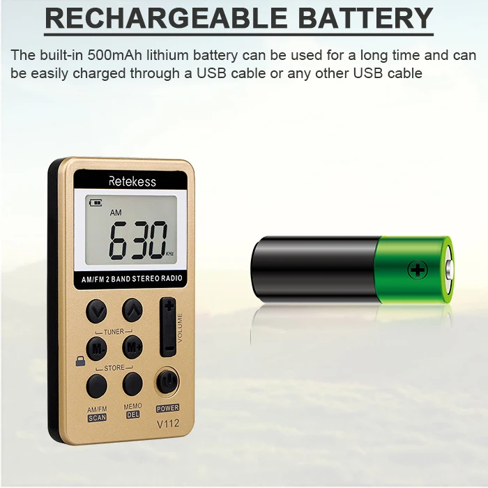 6 、Встроенный литиевый аккумулятор 500 мАч для маленького радио V112 am fm. Для зарядки радио есть usb-кабель.