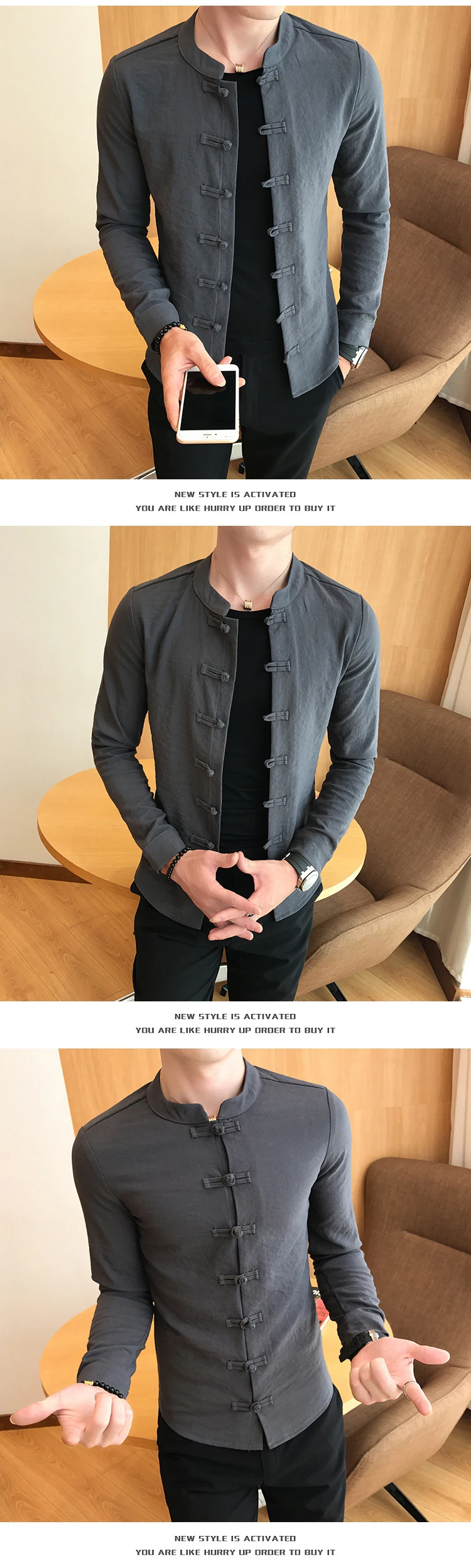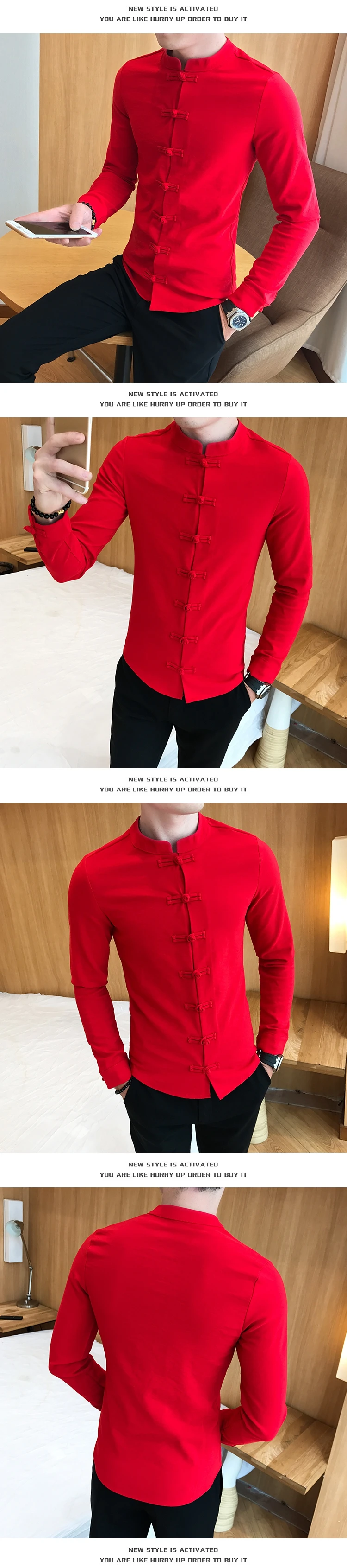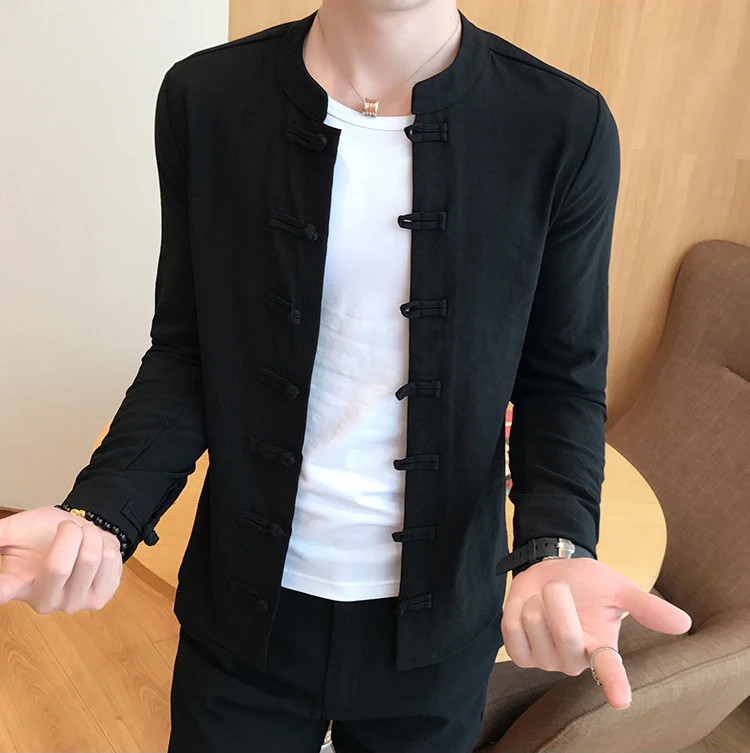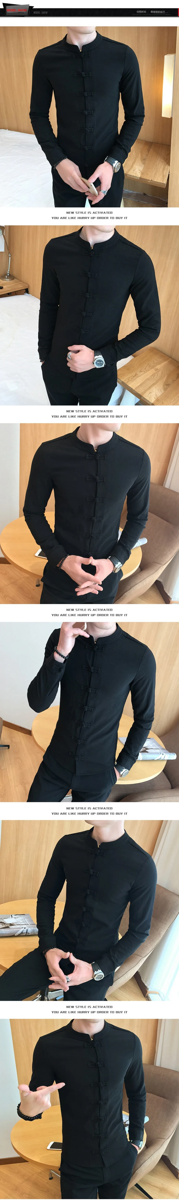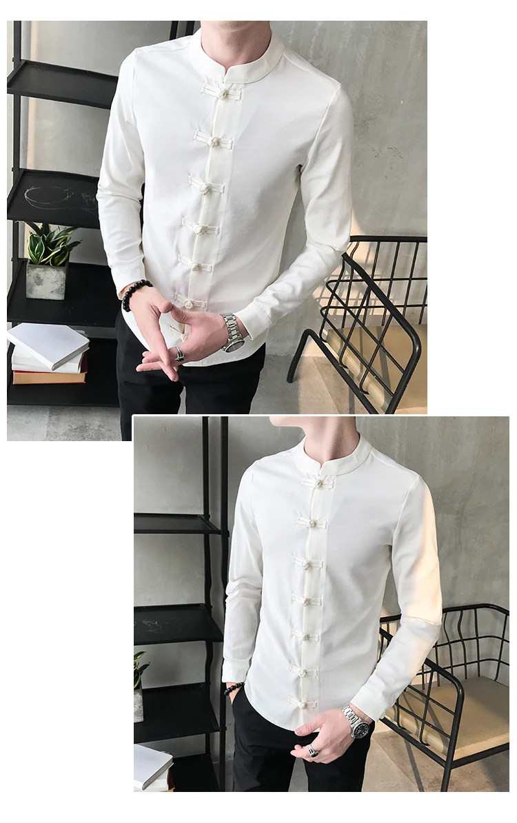 Китайская рубашка с воротником мужской воротник-мандарин, хлопковый однотонный с длинным рукавом, приталенный Повседневный Белый костюм Тан, льняная рубашка Кунг-фу для мужчин