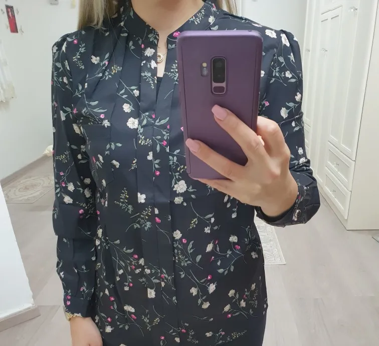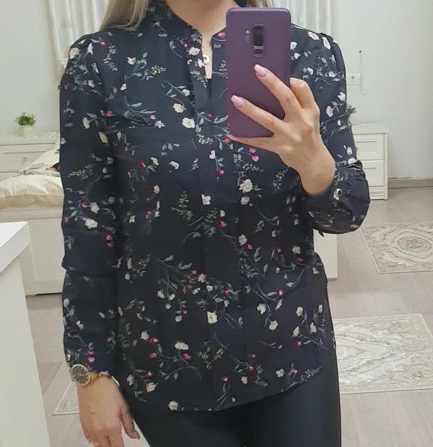 Блузка не шифоновая, обратите внимание. На фото, в общем-то, видно. Я заказывала темную расцветку, материал плотный, боюсь не будет дышать. На свой 44-46 заказала 2 XL - немного большая. На рост 158-длинная, заправлять -не красиво, впереди блузки выполнена жесткая планочка, наверное, на тонком флизелине, будет топорщиться. Качество соответствует цене, швы нормальные, выкроена правильно.