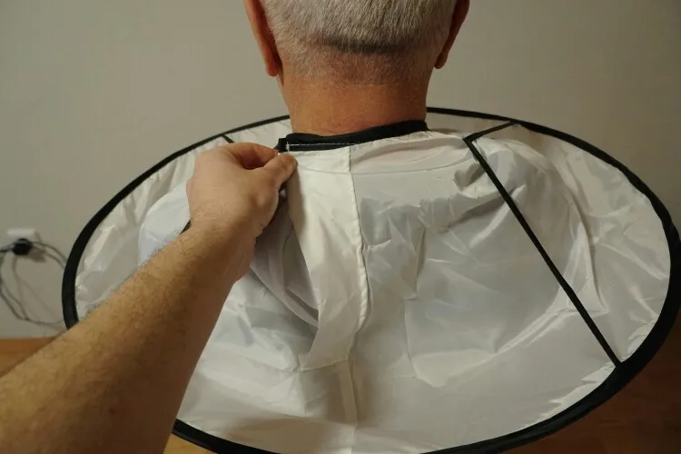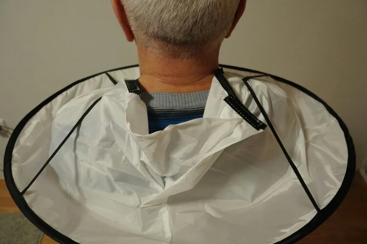 Эта фотография выглядит как есть. Я использовал его, и теперь я могу стричь волосы своего сына внутри дома и иметь очень минимальное подметание. Когда вы режете волосы, волосы упадут в материал, и их легко очистить
