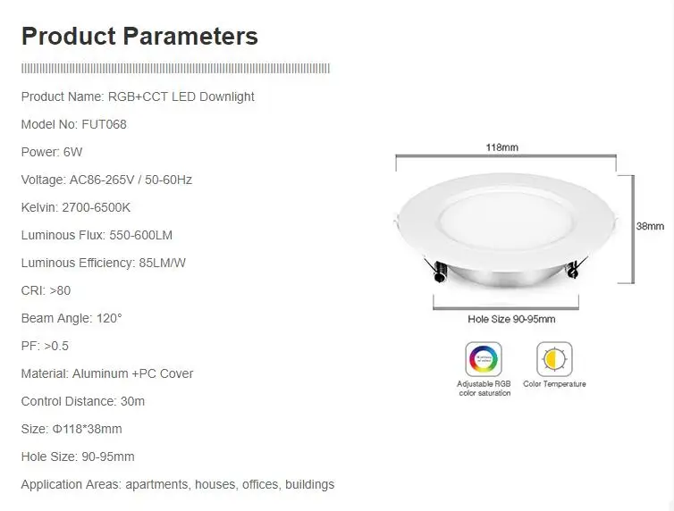 6 Вт RGB + CCT светодиодный светильник (FUT068 ) :