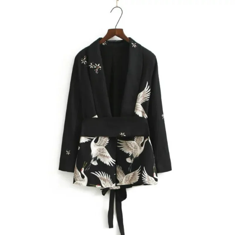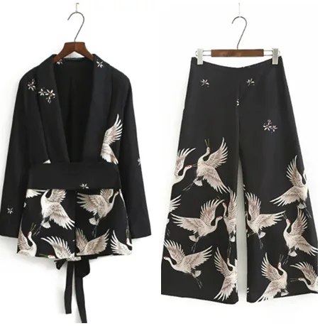 Женские костюмы, модные блейзеры с принтом птиц, женское черное кимоно, кардиган, Осенний Повседневный пиджак с отложным воротником, женский костюм, комплект из двух предметов