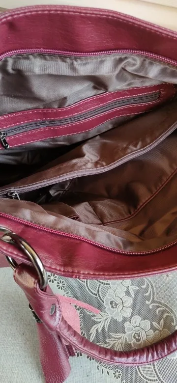 сумка пришла за 10 дней, очень удобная, красивая, вместительная, а главное, лёгкая, хороший кожзам, украшения из натуральной кожи на цепочке. Внутри ткань сильно шуршащая, под шелк сделана