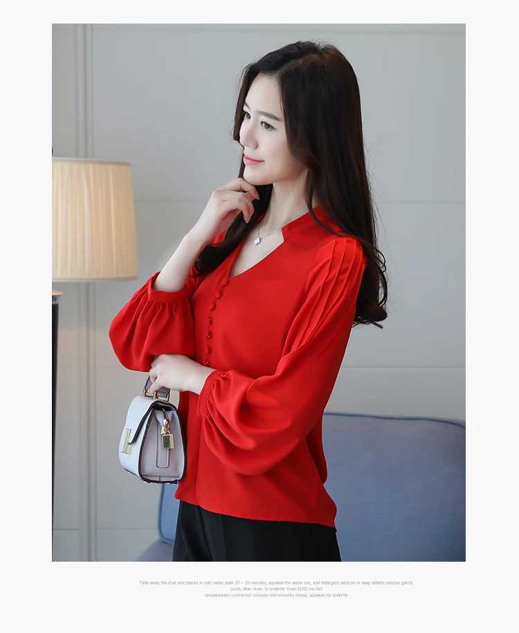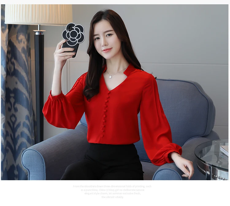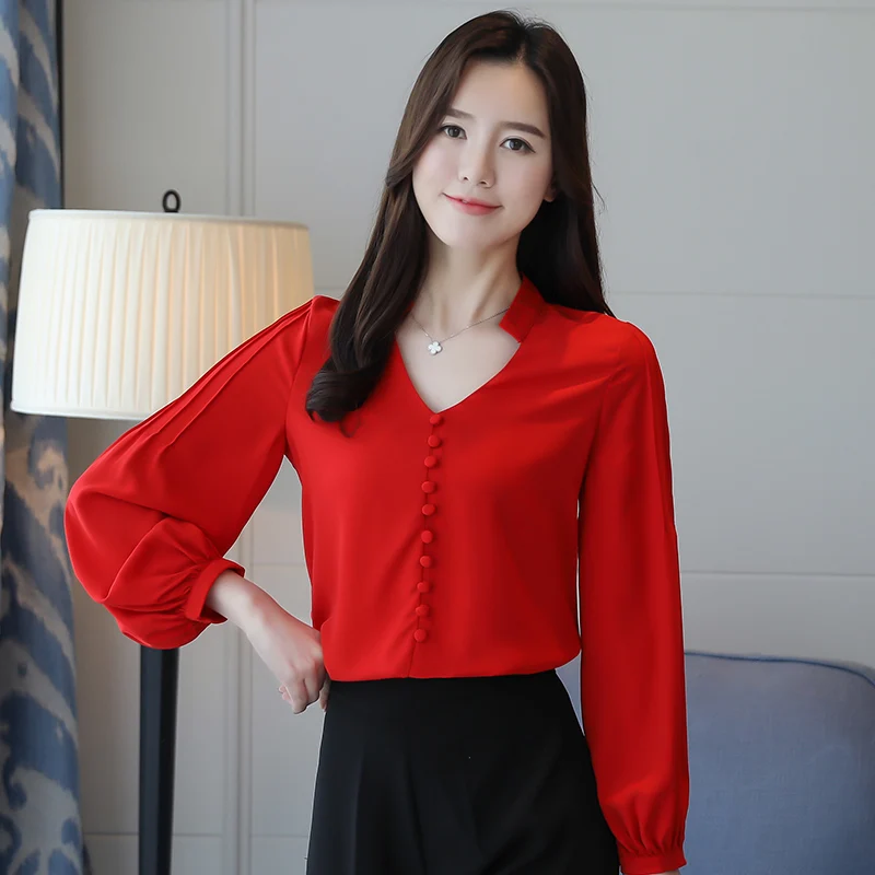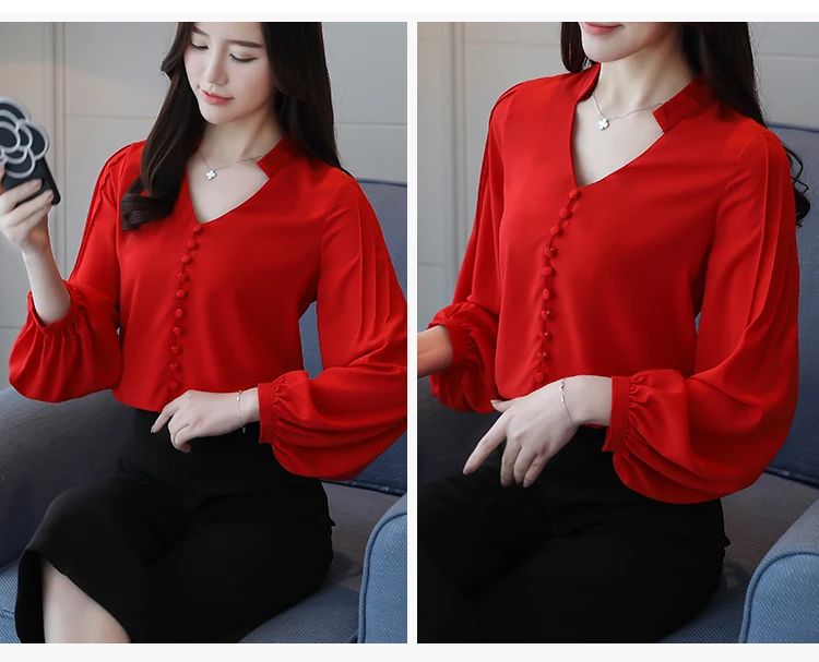 Модные женские блузки с длинным рукавом Женские рубашки Красная Шифоновая блузка рубашка с v-образным вырезом Офисная Рабочая женские одежда топы и блузки 0603 60