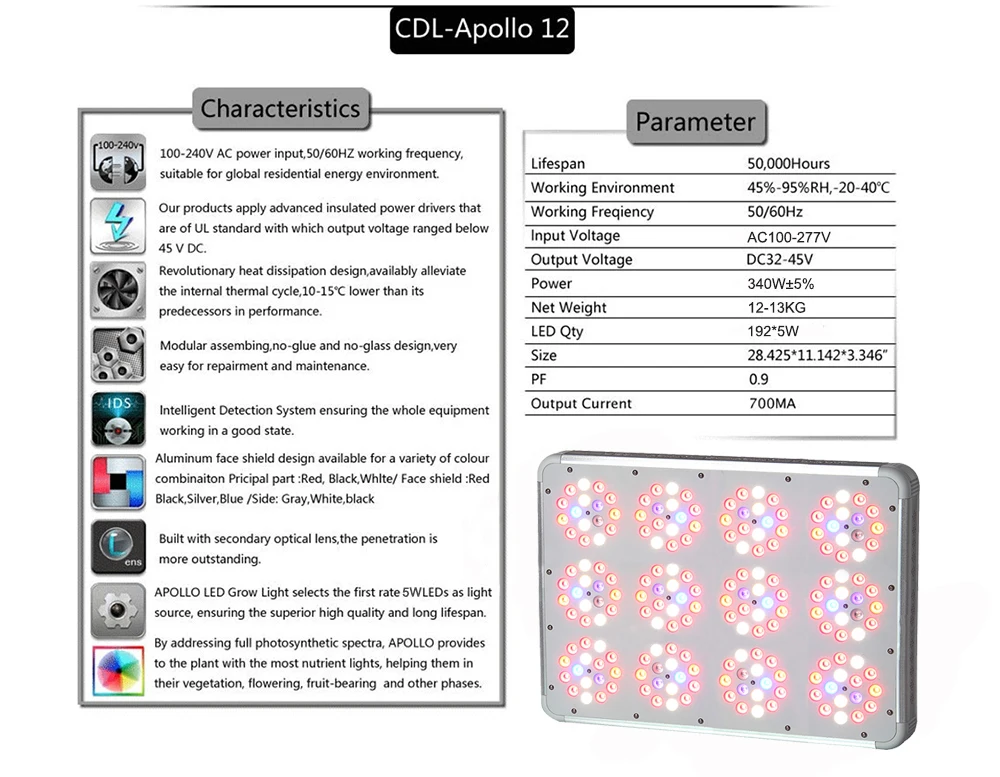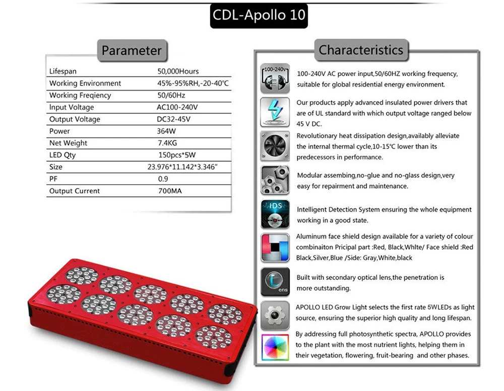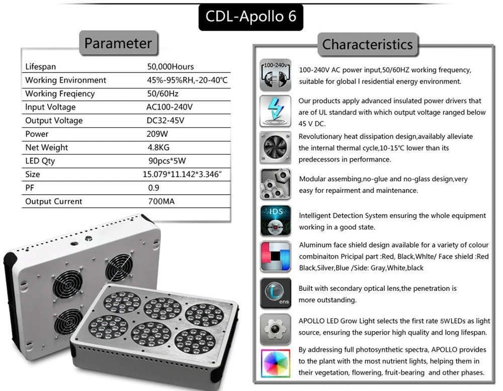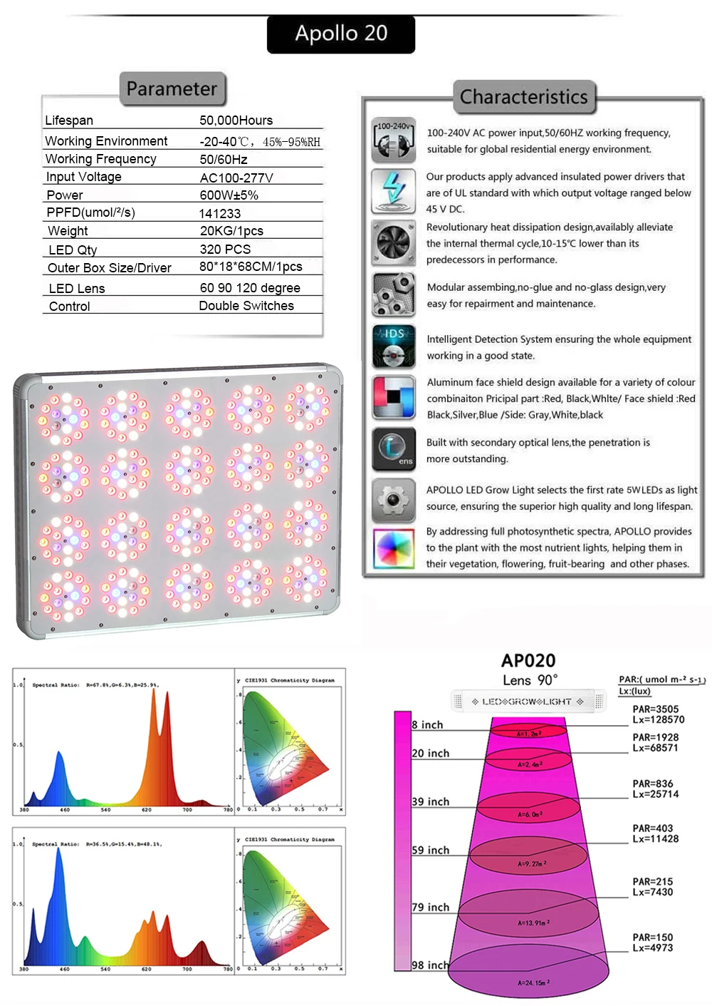 Особенности:Высокая эффективность оптимизирована для PAR, чрезвычайно достаточный светильник s Spectrum, супер светильникРастения растут быстрее и цветок больше: Улучшенный спектральный выход покрывает полный пар (400-730nm) способствует фотосинтезу для роста и блумминга,Высокая эффективность мощный 5 Вт BridgeLux/ Epistar светодиоды, низкое энергопотреблениеМощная система охлаждения вентилятора внутри, прохладная и тихаяРеволюционная Тепловая алюминиевая печатная плата, работает на 80% прохладнее, чем разрядка высокой интенсивности (HID)1 шт Сильные Висячие наборы доступны для легкой установкиВсе светодиодный s с Zener, чтобы гарантировать, что один светодиодный выход, остальное продолжает работать3 года длительный срок службы, энергосбережение и защита окружающей средыХарактеристики:Оптимальный полный спектр для выращивания и цветения: 645нм ~ 660нм, 620нм ~ 630нм, 450нм ~ 460нм, 430нм ~ 440нм, 2700K ~ 3000K, 3000K ~ 3500K,Реальный ИК-спектр Помогает растениям цветок лучше: 730 нмСветодиодный Количество светодиодов: 60/90/120/150/180/240/270/300 шт. эксклюзивный 5 Вт Bridgelux/ Epistar расти светодиодный sМаксимальная светодиодный Мощность: 300/450/600/750/900/1200/1350/1500WУгол обзора: 90 градусов и 120 градусов смешанный светодиодный светильник, разные цвета очень хорошо сочетаютсяСрок службы: ≥ 3 годаГарантия: 3 годаРабочая температура: от-20 до 40 градусовПосылка включает: 1 x светодиодный светильник Apollo1 x Бесплатный подвесной комплект1 x Бесплатный шнур питания