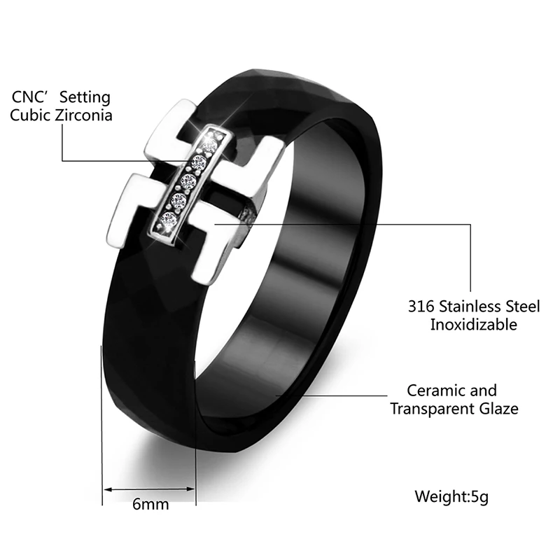 Кольцо из керамики женское, черное с белым кубическим цирконием, 6 мм