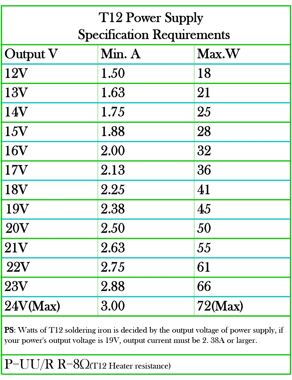 Мощность (третья колонка) определяется напряжением (Первая колонка), если ток достигает минимального тока (вторая колонка).