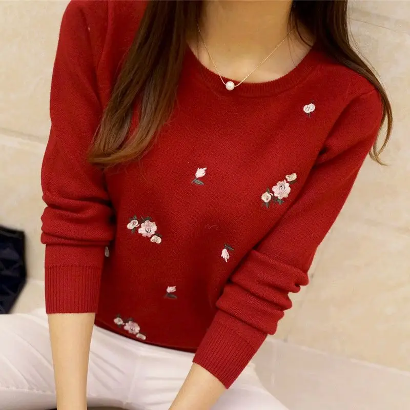 Пуловер женский осенне-зимний трикотажный с длинным рукавом и цветочной вышивкой, 2017