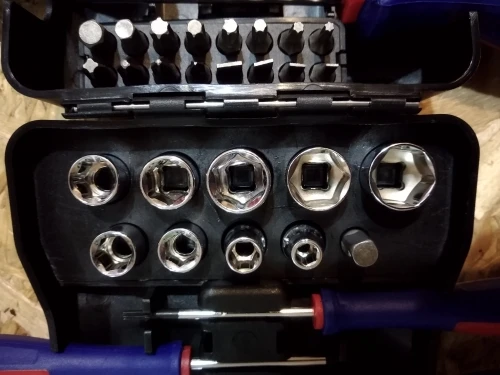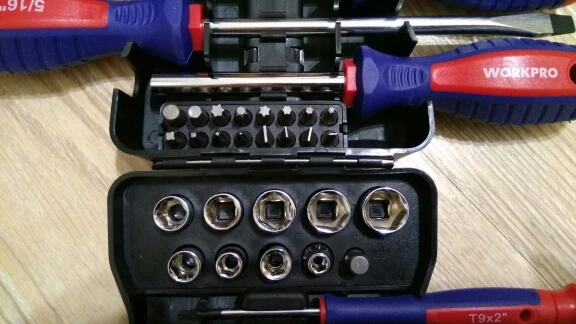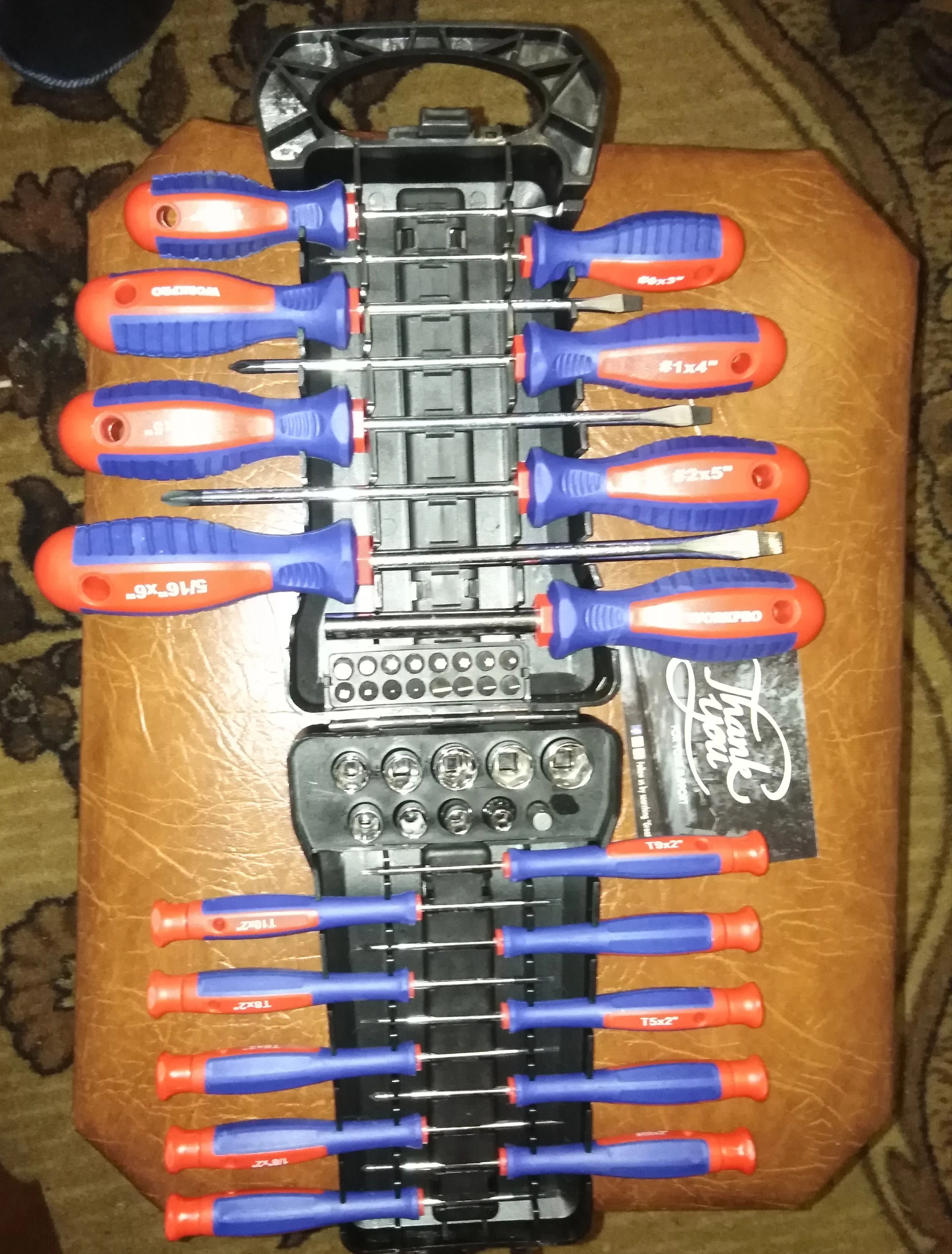 В моем наборе обозначения отверток и шестигранных головок оказалось в дюймах, а не в мм. Мне неважно, но кому важно - учитывайте это. А вообще - отлчный набор, чтобы закинуть в гараж или в багажник автомобиля. Набор компактный - занимает минимум места. Качество металла мне понравилось - далеко не пластилин. А силовые отвертки неубиваемы. Общее впечатление - на четверку с минусом. Не очень удобно доставать из пазов и защелкивать. Некоторые съемные наконечники достаются с огромным трудом. Но для периодического использования пойдет, тем более за такую цену. С купоном из группы вконтакте GXSmart я заплатил всего 578 руб. (в пересчете 7.78 долларов) с бесплатной доставкой курьером - отличная цена. Ещё пару наборов взял на подарки.
