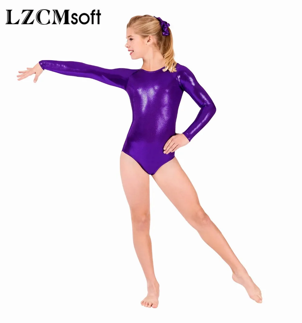 LZCMsoftсеребряное трико с длинными рукавами для девочек, блестящее металлическое гимнастическое трико, цельнокроеные Детские Балетные танцевальные костюмы для выступлений
