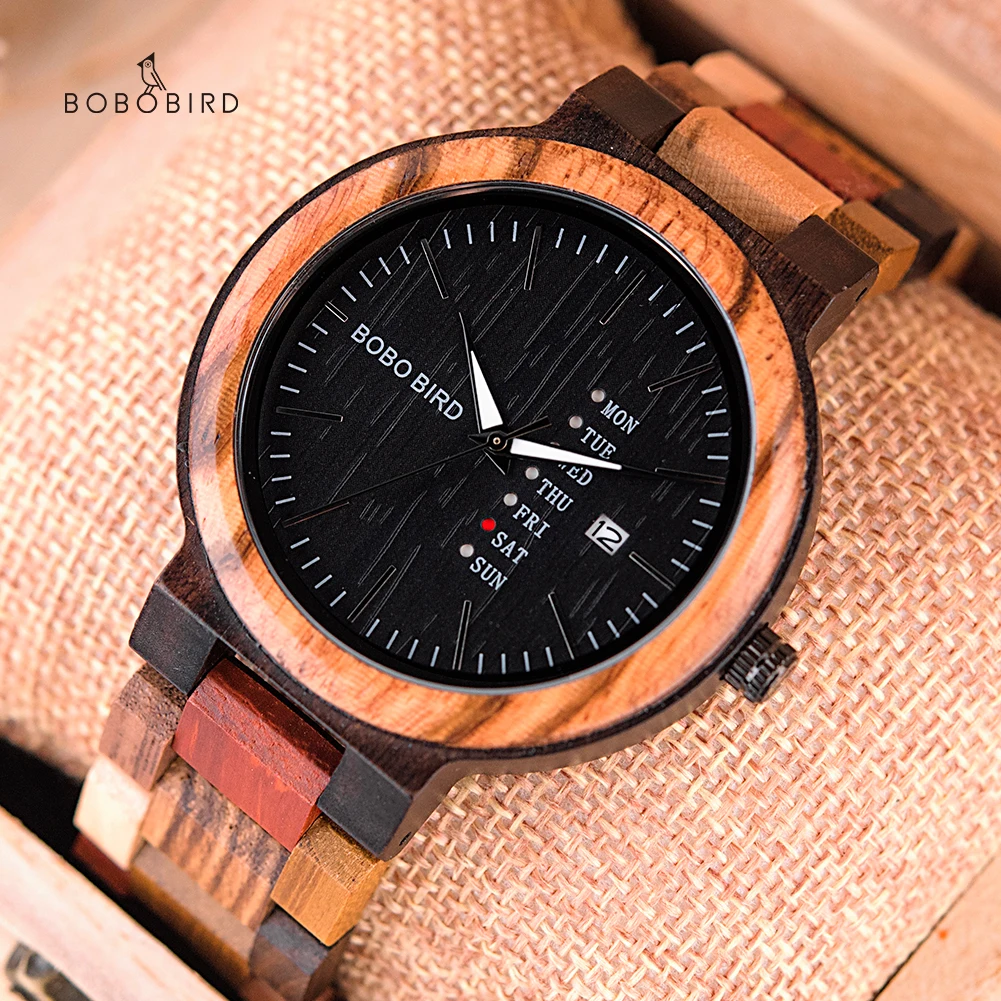 Часы наручные Zegarek BOBO BIRD для мужчин и женщин, кварцевые цветные, с календарем, отображением недели, с деревянным ремешком
