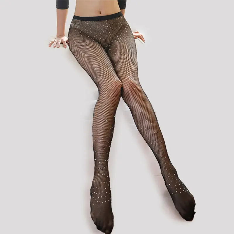Сексуальные женские колготки стстразы, блестящие ажурные колготки со стразами, ажурные мелкие сетчатые колготки, блестящие чулки в сеточку