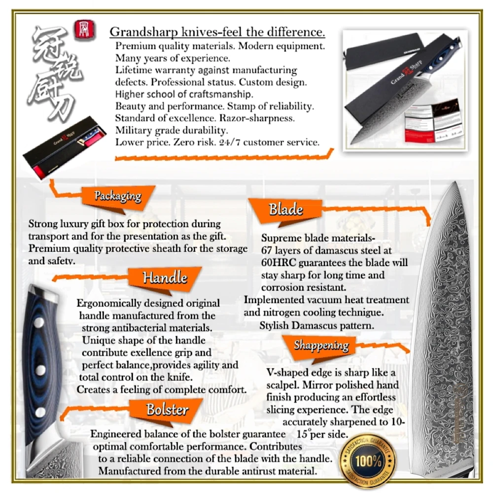 Лезвие:67-слойная Дамасская сталь, импортированная из Японии. VG-10 стальной режущий сердечник; 33-слойная нержавеющая сталь SUS430 & SUS431 с каждой стороны