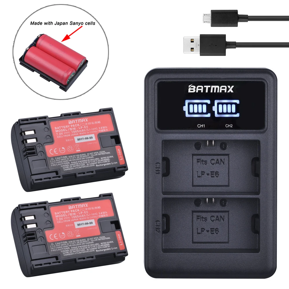 Зарядное устройство Sanyo для Canon EOS 6D, 7D, 5DS, 5DSR, 5D Mark II, 5D, 60D, 70D, 80D, 2 шт., LP-E6, LP, E6, LP-E6N, Япония