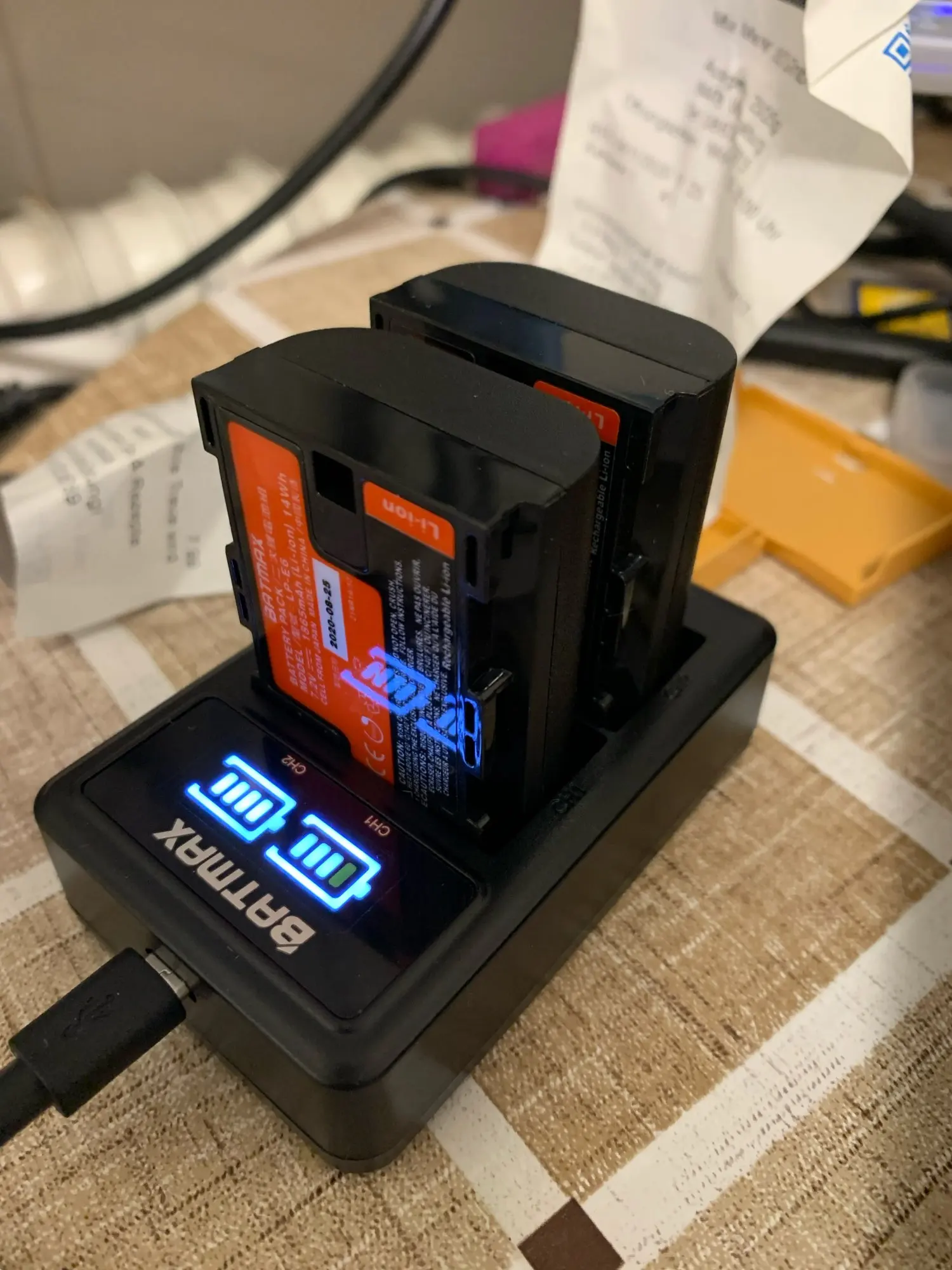 26 дней в Польшу. Батареи выглядят хорошо, правильный вес (может открыть один позже, чтобы проверить Sanyo cells). Проблема только в том, что обе батареи идентифицируются в камере как одна батарея (3-й выбор, нижний аккумулятор) не знаю, является ли это вещью, но их Электроника как клоны с тем же внутренним кодом. Зарядное устройство в порядке. 1 канал делает ~ 5 Вт и два канала ~ 9 Вт. Таким образом, половина мощности на батарею оригинального зарядного устройства, но он мобильный и заряжает 2 батареи одновременно.
