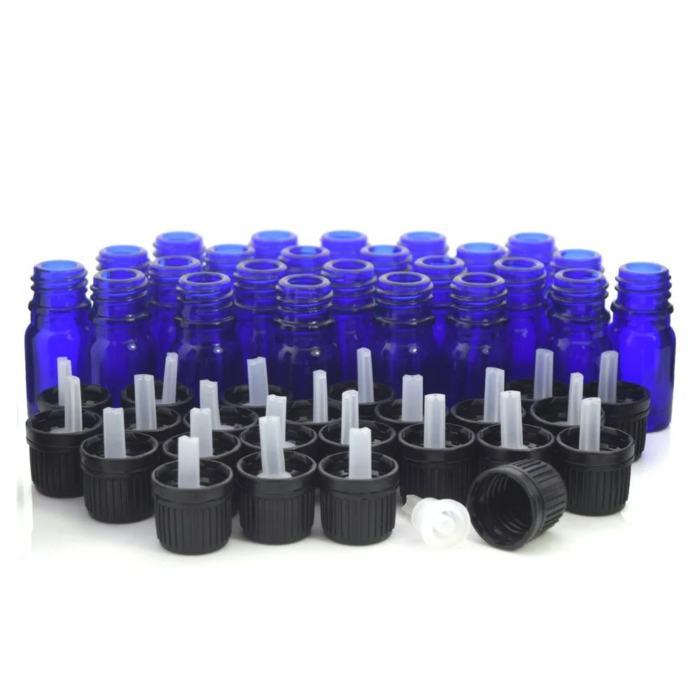 Особенности продукта:24 - 5 мл, кобальтовые синие стеклянные бутылки, с евро отверстием и черными прозрачными колпачками.