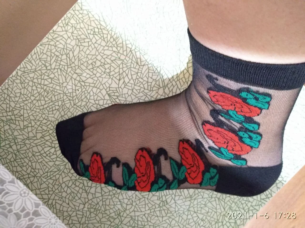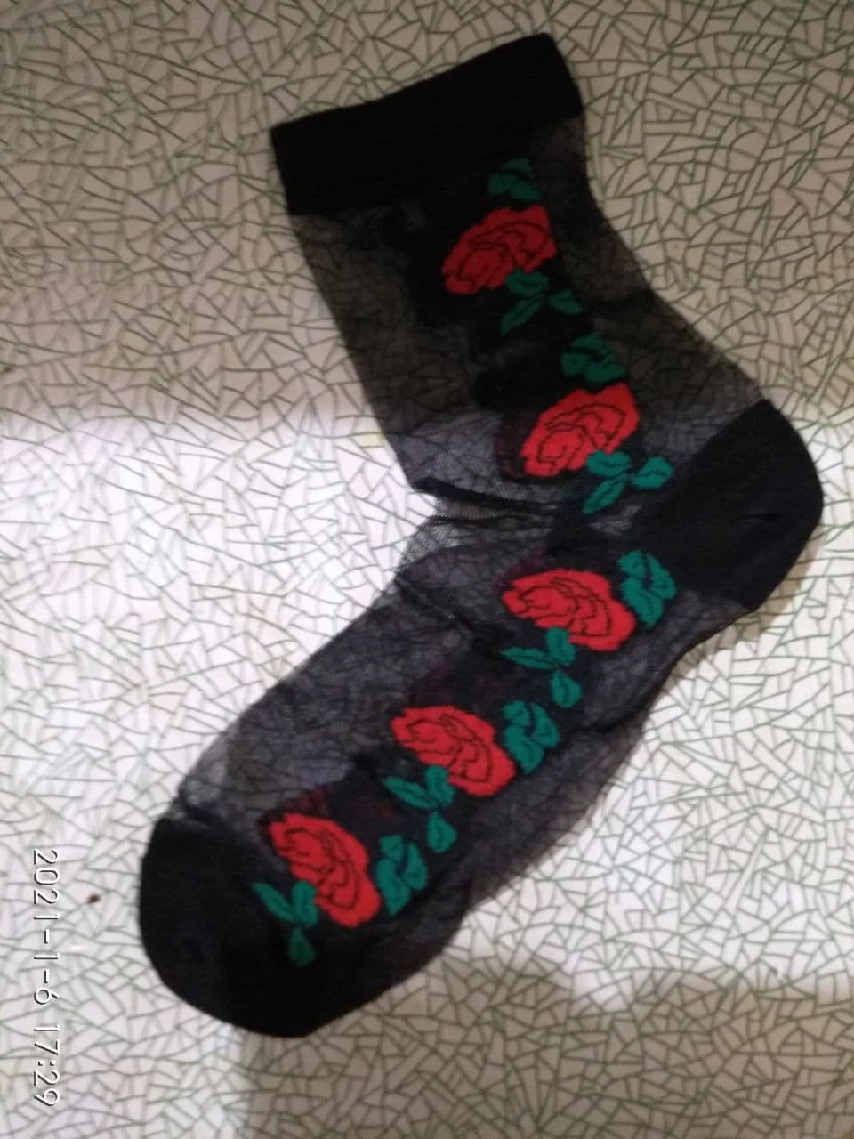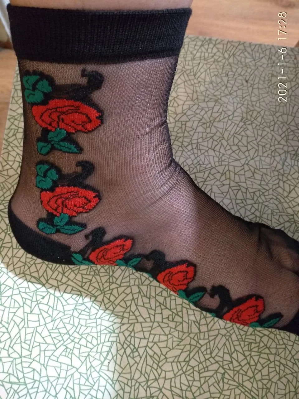 Долгая доставка 53 дня, положили в почтомат. Упаковано в обычный пластиковый пакет. Носочки соответствуют описанию, немного тянутся, пятка и носок усилены.Носки черные, прозрачные.Подойдут для весны и осени, для лета будет жарко. Розочки на капроне вышиты,а не аппликация. Отправили быстро.Товар и продавца рекомендую.