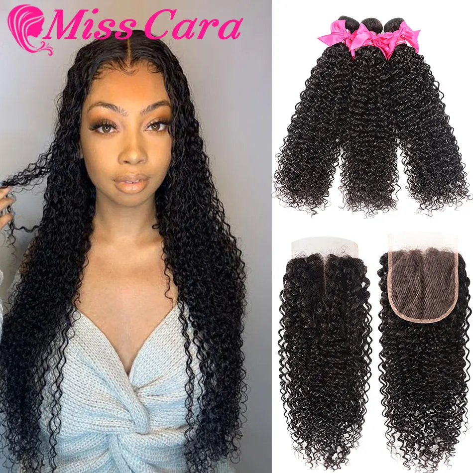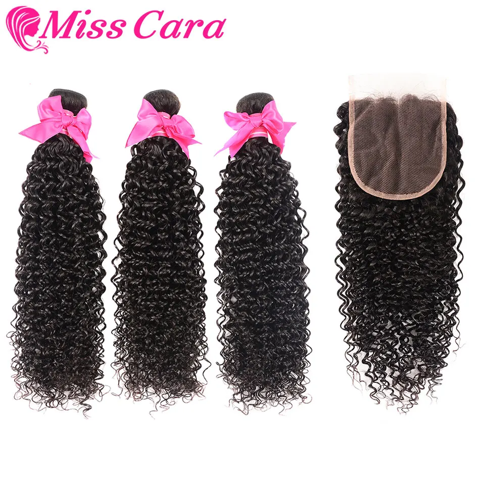 Монгольский курчавый и вьющийся волос с закрытием 100% человеческие волосы 3/4 пучки с закрытием Miss Cara Remy пучки волос с закрытием