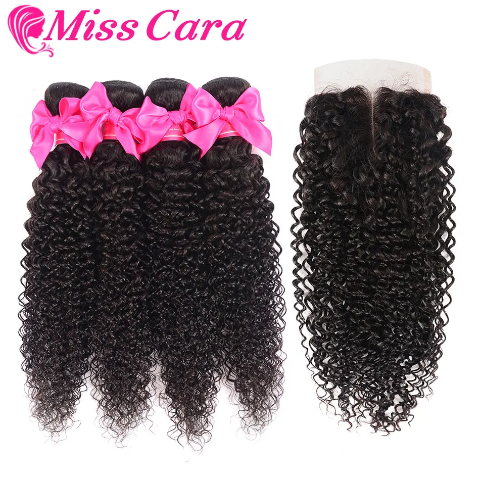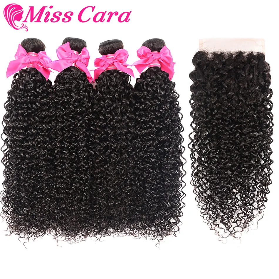 Монгольский курчавый и вьющийся волос с закрытием 100% человеческие волосы 34 пучки с закрытием Miss Cara Remy пучки волос с закрытием