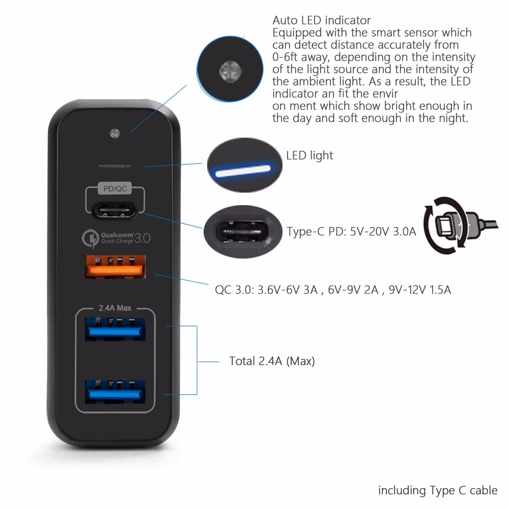Работает по всему миру: наша зарядная станция ultra portable использует AC напряжение 100 В-240 В для всемирной совместимостиЧетыре умных порта: 1 USB-C и 1 USB-A порт совместим с PD/QC3.0. И другие 2 являются стандартными портами USB-A. Bulit-в интеллектуальном чипе допускается одновременная многофункциональная зарядка на высокой скорости Автоматический индикатор питания Светодиодный индикатор: Оснащен датчиком света, светодиодный Светодиодный индикатор отрегулировал бы яркость к окружающему свету, который бы не слишком яркий в ночное время или слишком тусклый В течение дня Технология быстрой зарядки: порты PD/QC3.0 заряжают USB-устройства, как Новый MacBook или samsung Galaxy Note8/S8 на полной скорости. В других двух портах USB-A, интеллектуальное зарядное устройство интеллигентно распознает устройство и обеспечивает настроенный и точный ток зарядки, каждый порт 2.4A Max. Портативный размер: компактный, портативный, легкий дизайн и AC 100-240 В вход идеально подходит для международных путешествий Qualcomm Quick Charge 3,0 и доставка питания