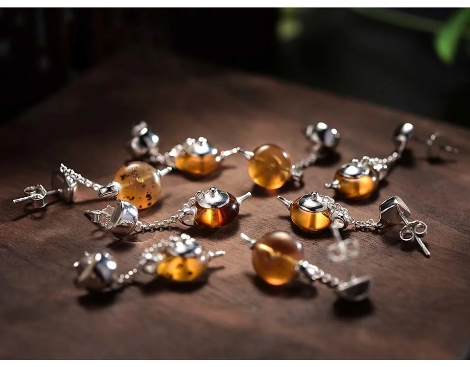 Lotus весело Настоящее стерлингового серебра 925 натурального янтаря ручной работы Красивые ювелирные изделия милый чайник Длинные Висячие серьги для Для женщин Bijoux