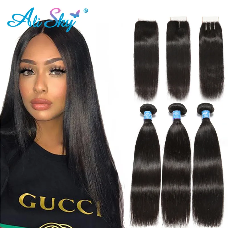 Перуанские прямые волосы Alisky, пучки с кружевной застежкой, человеческие волосы 4x4 Remy, 100% человеческие волосы, 3 пряди застежка