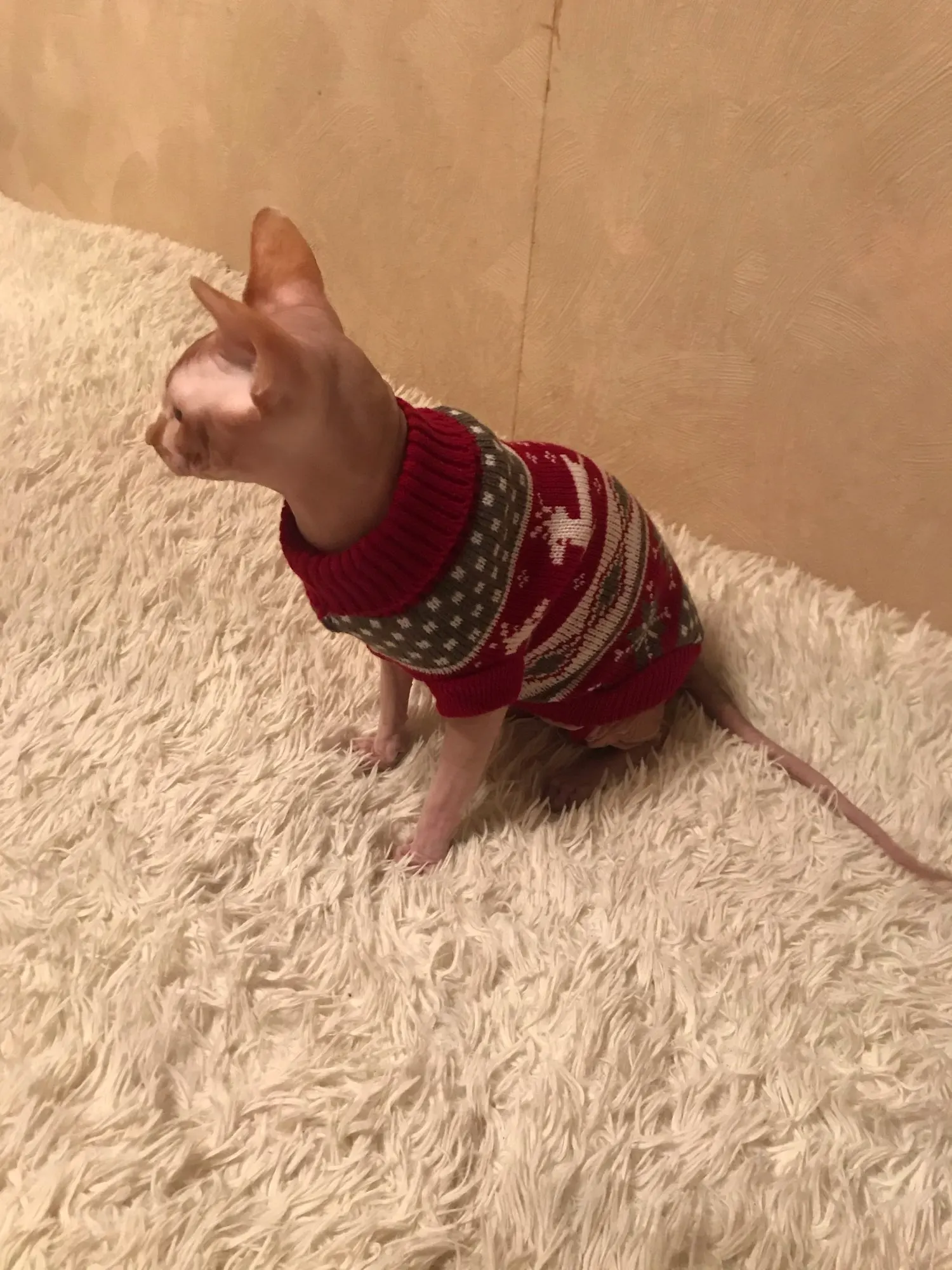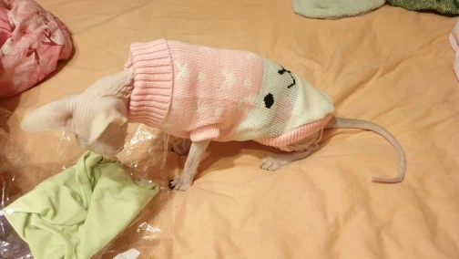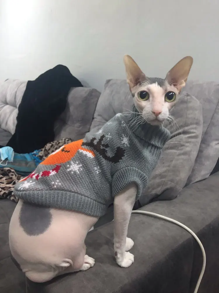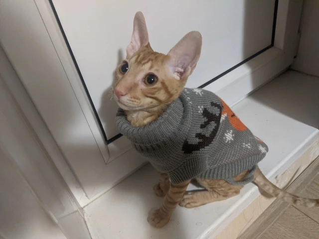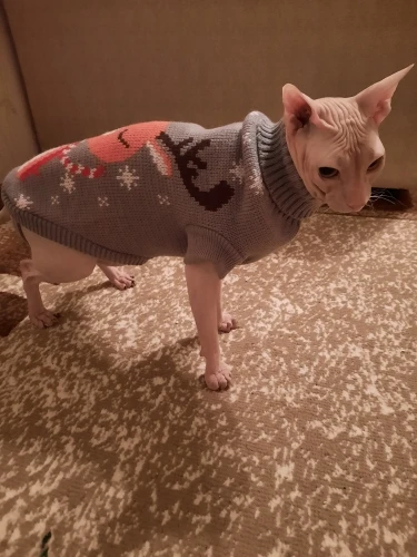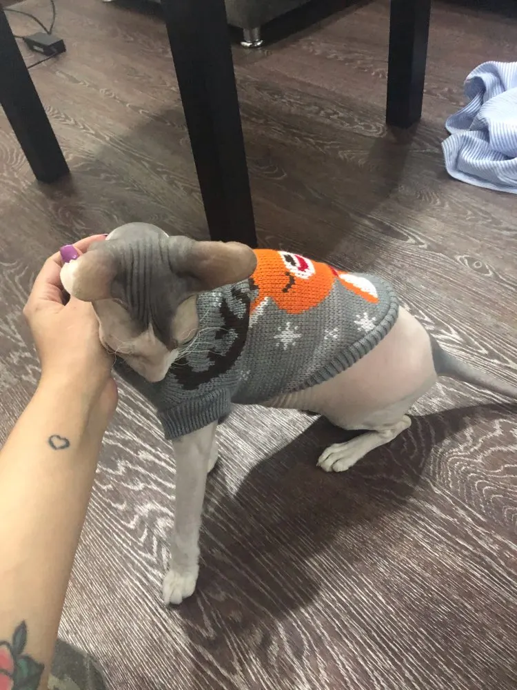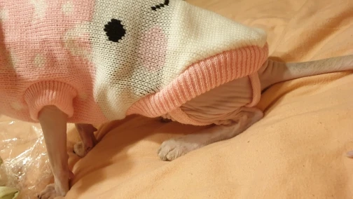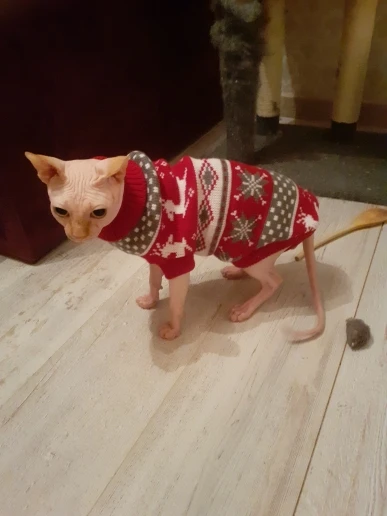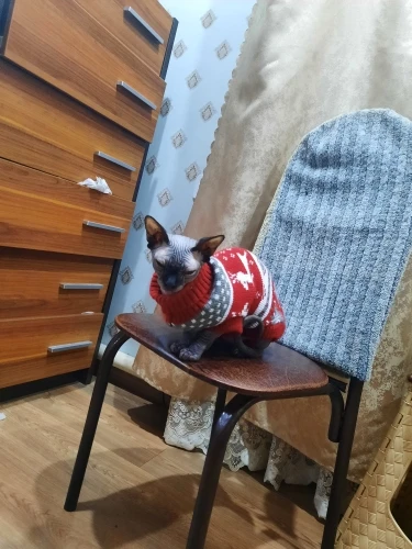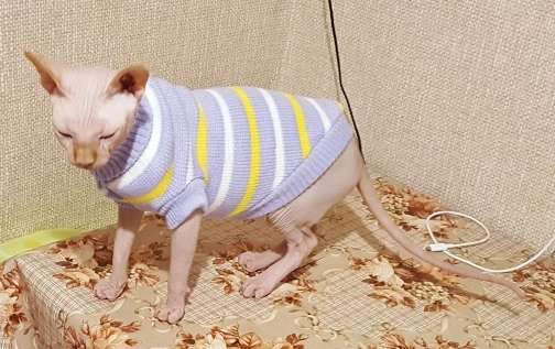 Очень повезло что угадала с размером. Свитером очень довольна. На годовалую кошечку сфинкса подошел 10-й размер