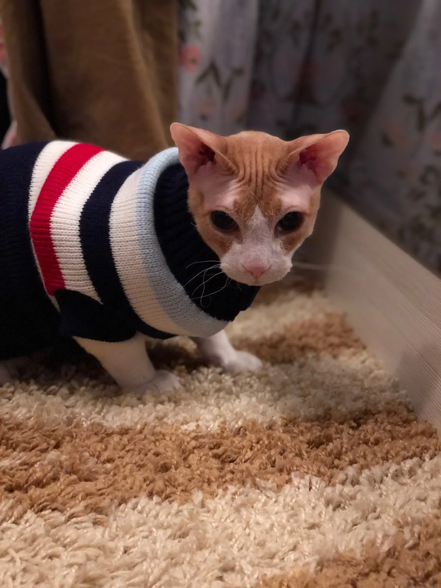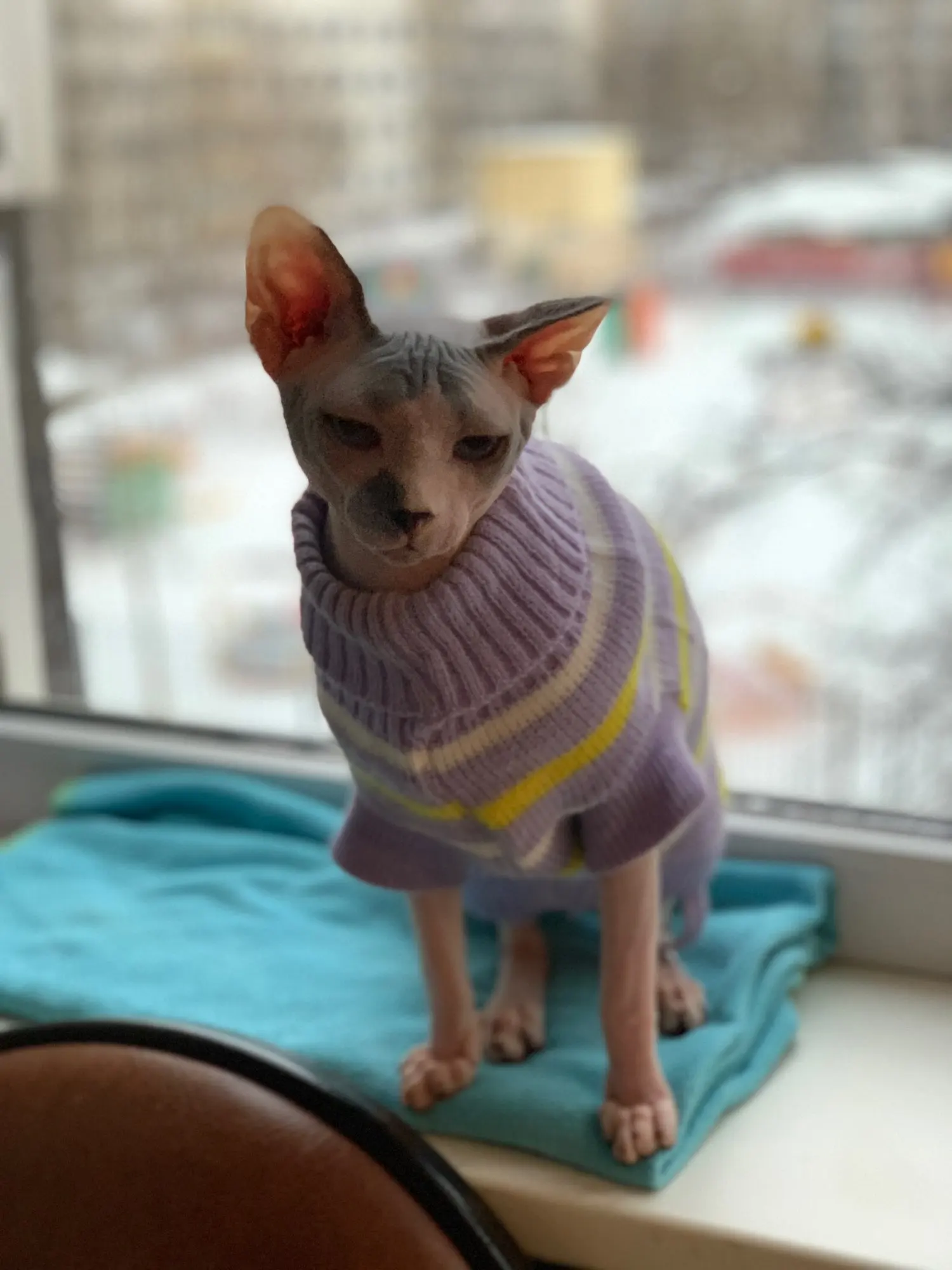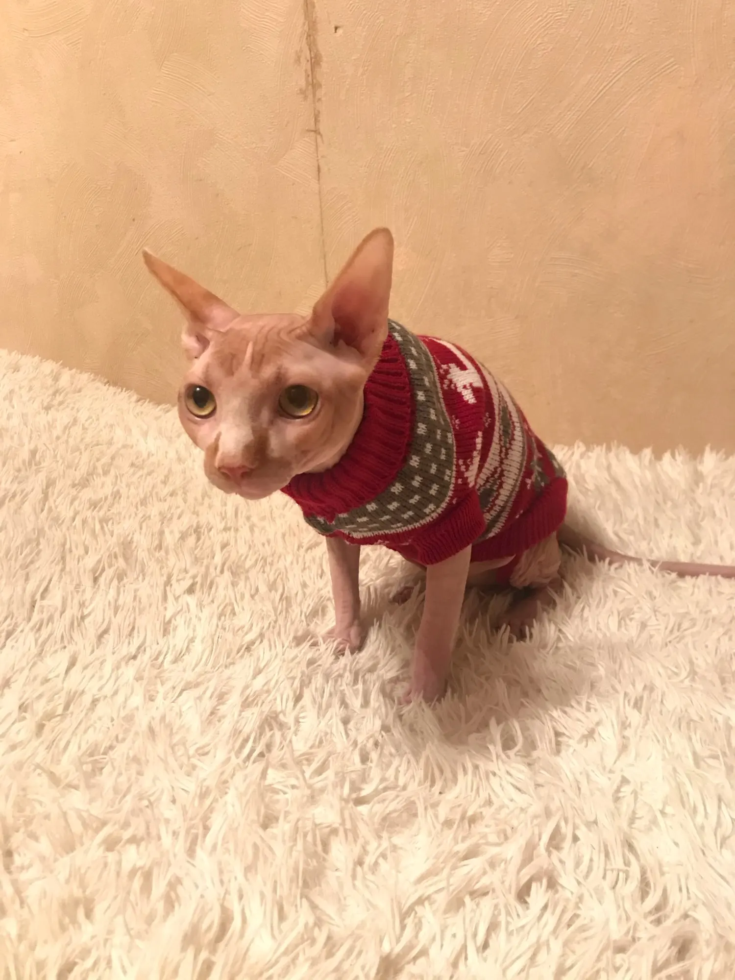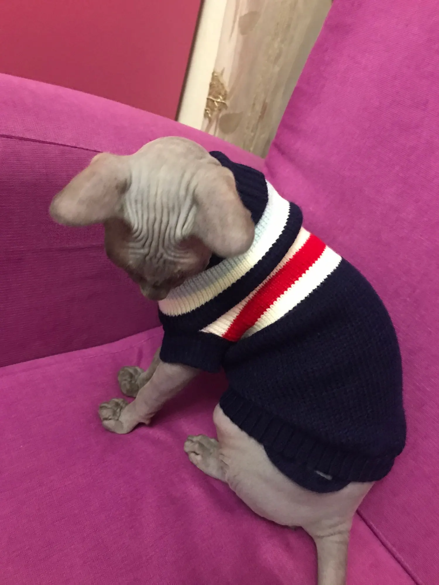 Очень повезло что угадала с размером. Свитером очень довольна. На годовалую кошечку сфинкса подошел 10-й размер