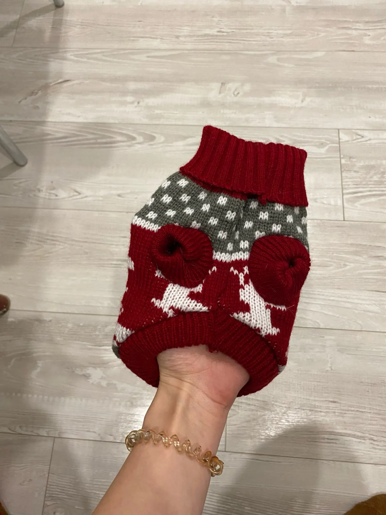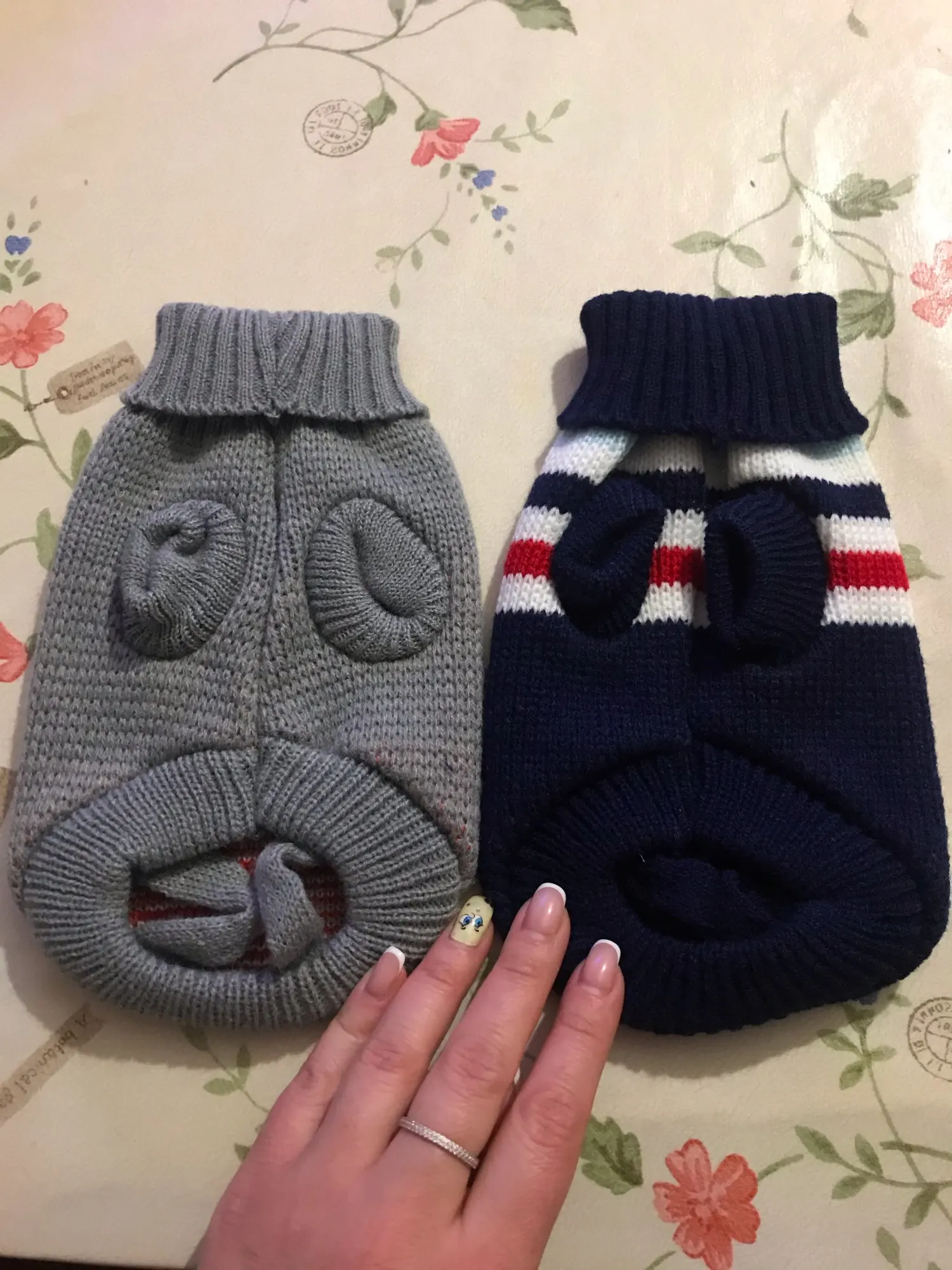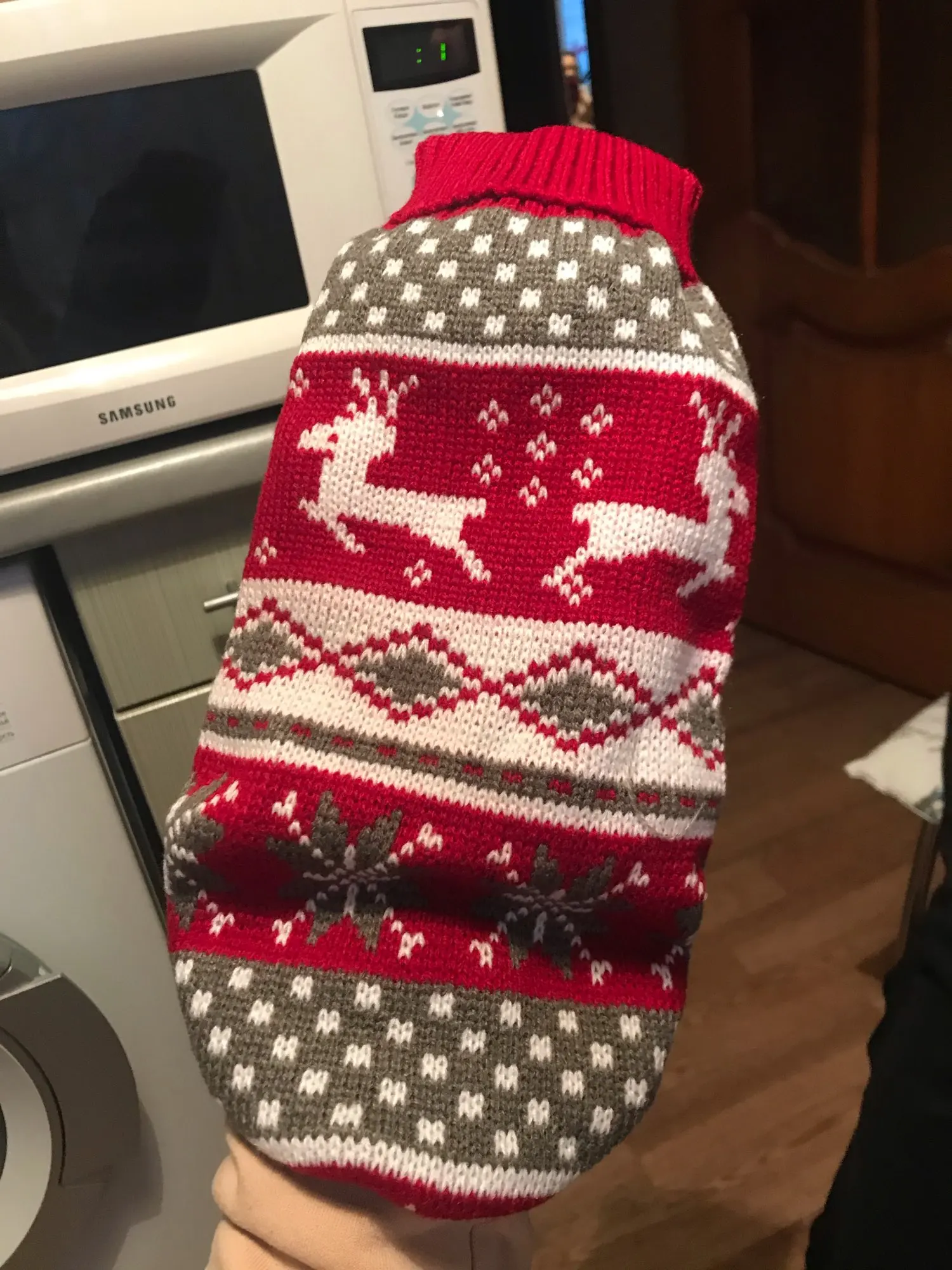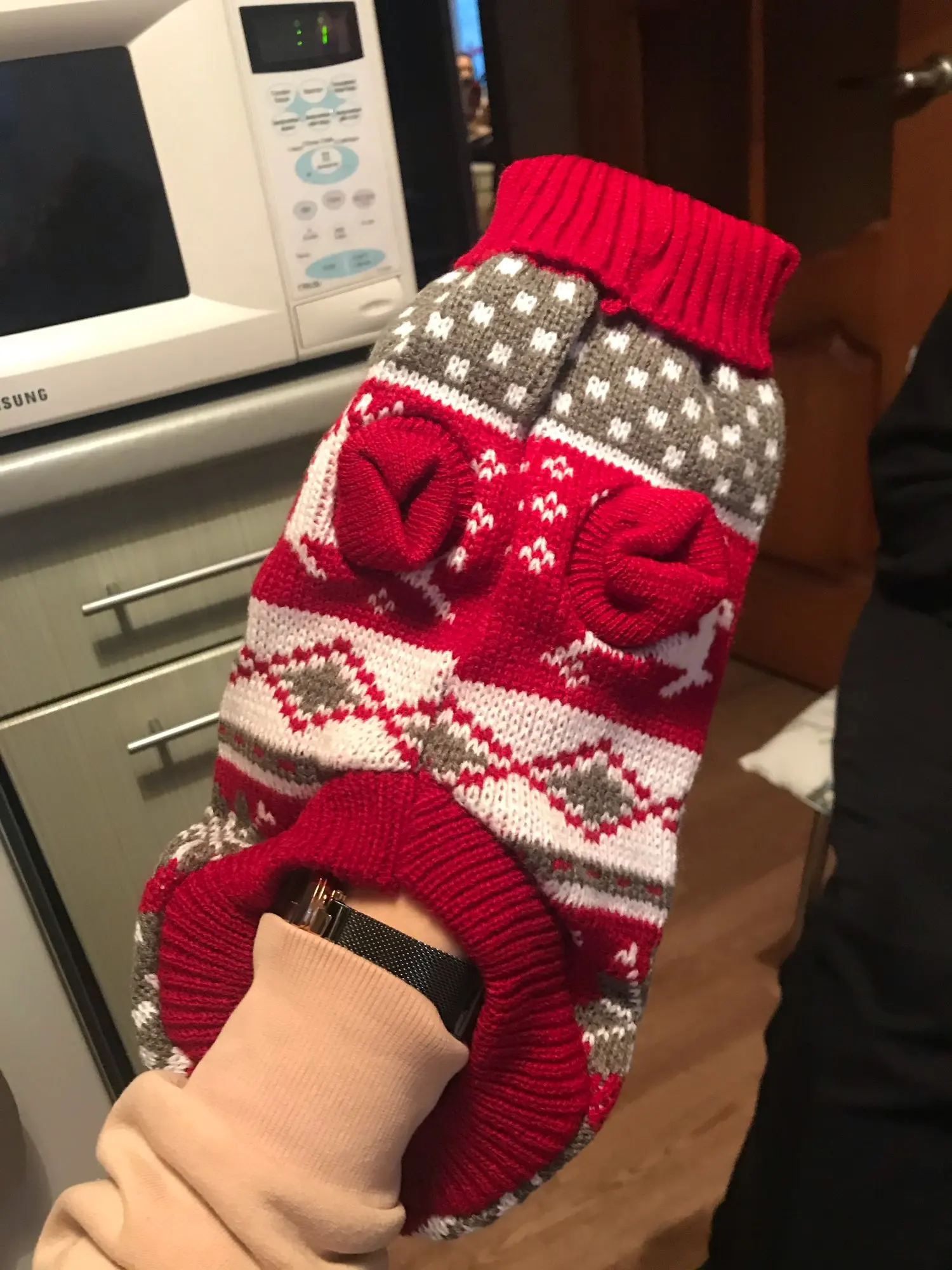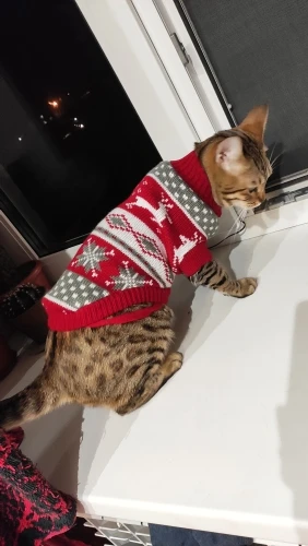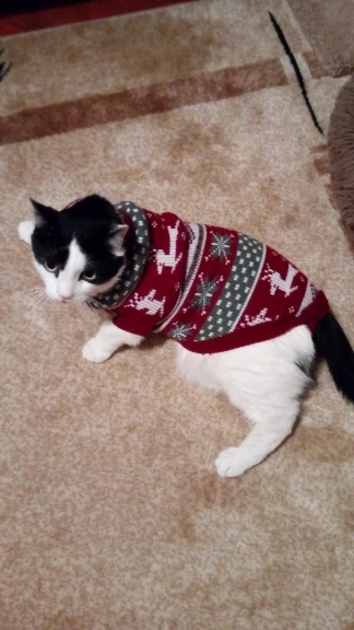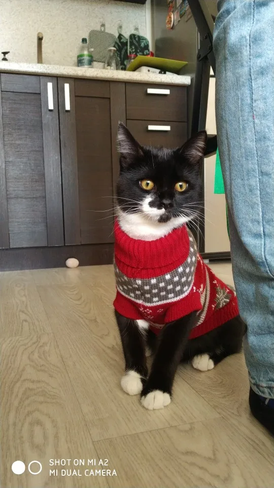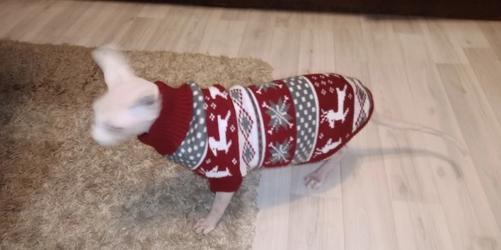 Свитерок очень качественный. Нитки не торчат, вязка плотная. Но коту одевала с боем. Может, если не запутались бы с отверстиями для лап, обошлось бы спокойнее. Но кот ходит в нём с трудом, хотя, размер самый большой. Попробую другому котику, поменьше. А по позже и этому снова.