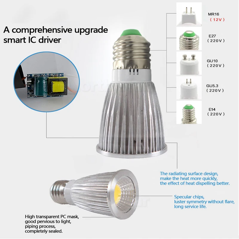 Яркие светодиодные лампы MR16 12 В с регулируемой яркостью 9 Вт 12 Вт 15 Вт 85 ~ 265 В GU10, прожекторы COB E27 E14 GU5.3, светодиодные лампы CE/RoHS, теплый/холодный белый