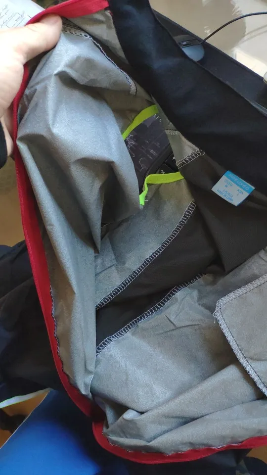 Я примерил его на выход, и мне понравилась ткань, это непродуваемая ткань, которая хорошо защищает, когда вы идете быстро, но в то же время она достаточно дышащая благодаря сетчатой ткани назад. Он очень легко удваивается и почти не занимает места. Сзади нет только маленьких карманов спереди.