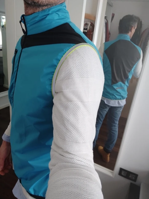 Очень хороший, дышащий материал в задней части и передняя ветровка. Гладкие беговые молнии и идеальный размер для меня. 177 см/78 кг Размер L регулируется без чрезмерного затягивания, и у меня широкая спина. На мой вкус. Это второй кусок этого бренда, и я в восторге.
