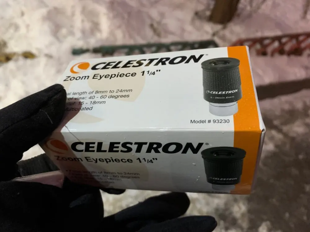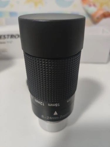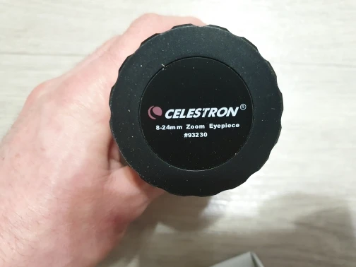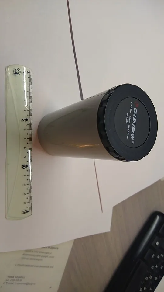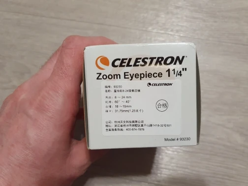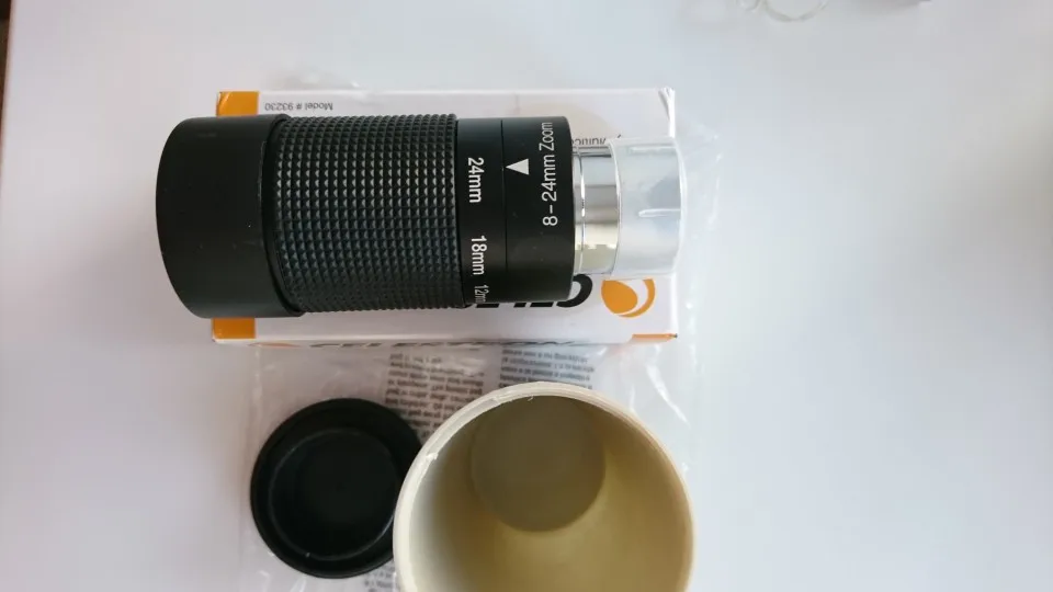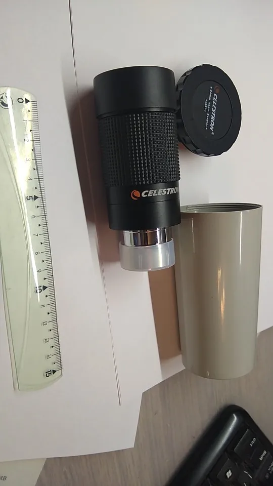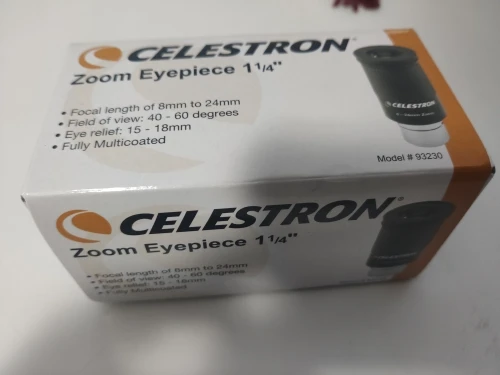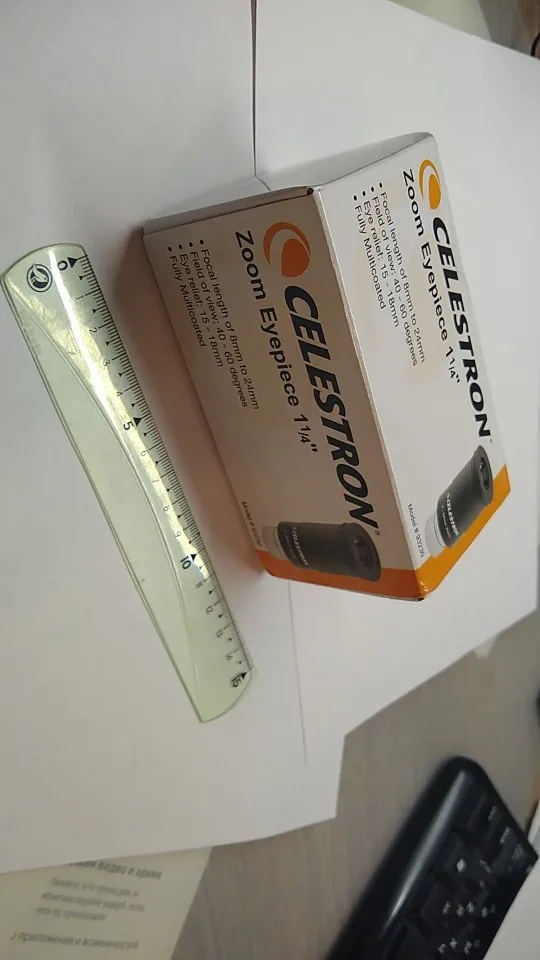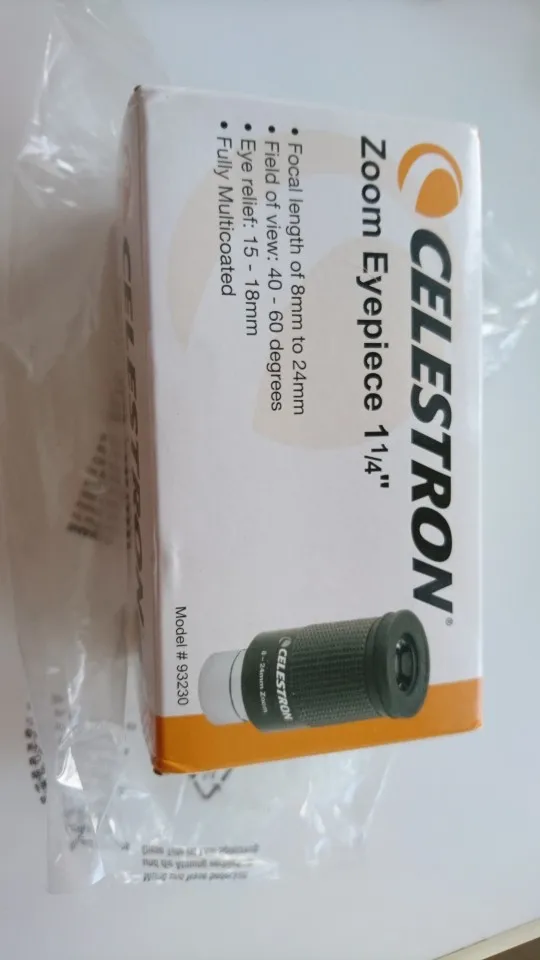 Отличный оригинальный окуляр Celestron, пришёл в фирменной коробочке. Внутри коробки пластиковый защитный тубус с плотной крышкой, надёжно фиксирующей окуляр и предотвращающей его болтание внутри тубуса. Сам окуляр с просветлением зелёного цвета, прорезиненное кольцо зума вращается с некоторым усилием. Под резиновым наглазником есть резьба для T-кольца.