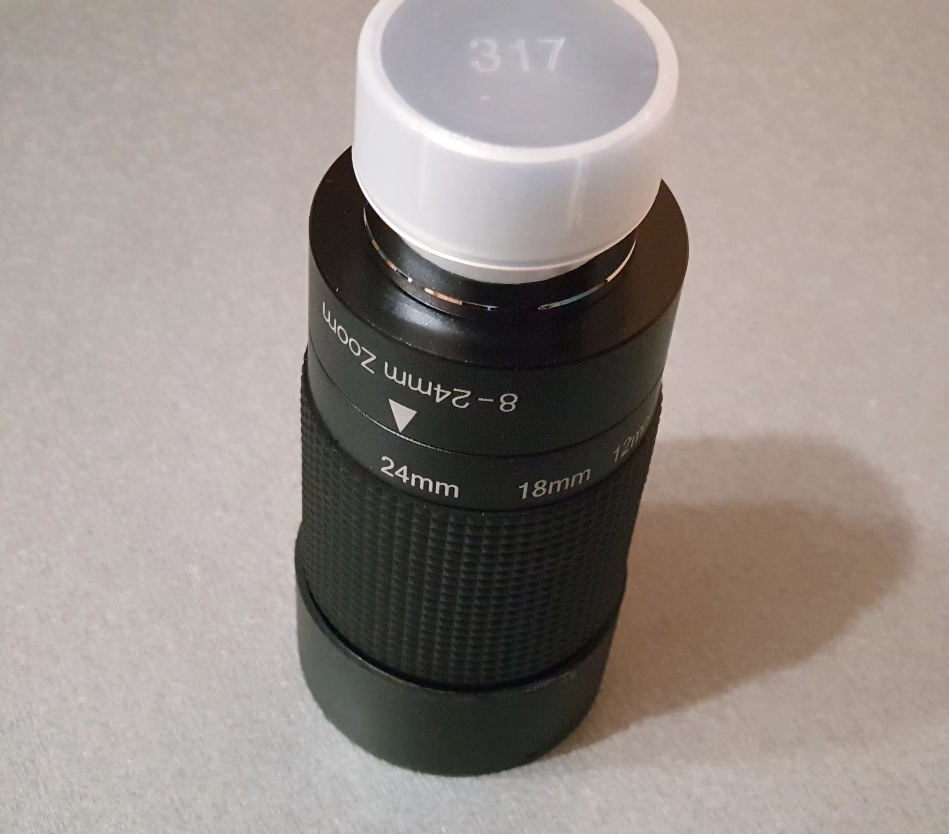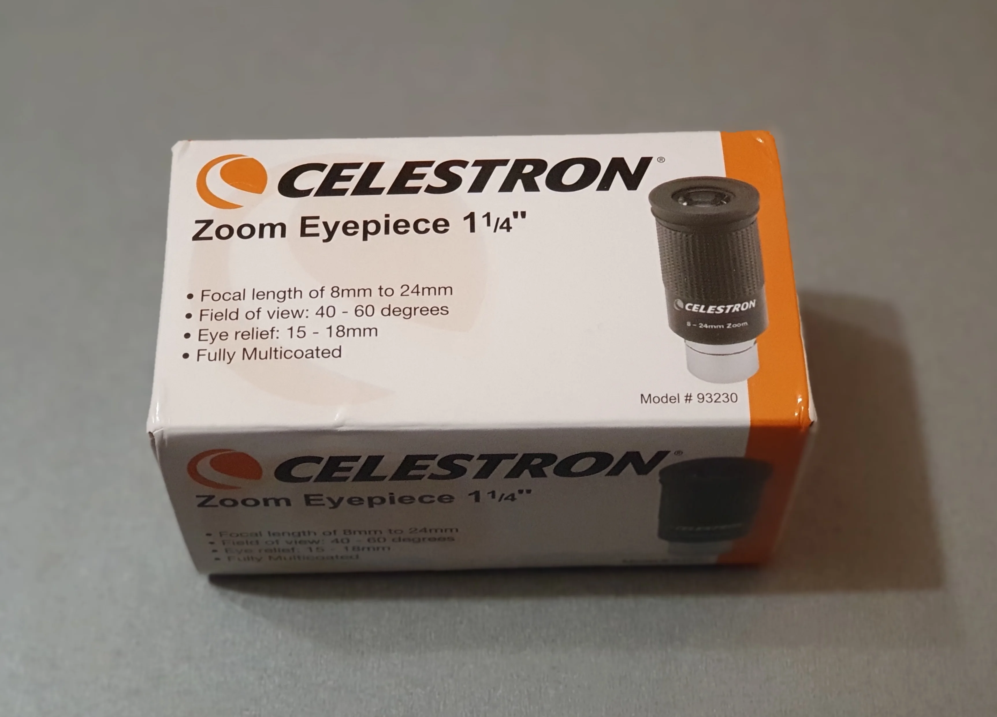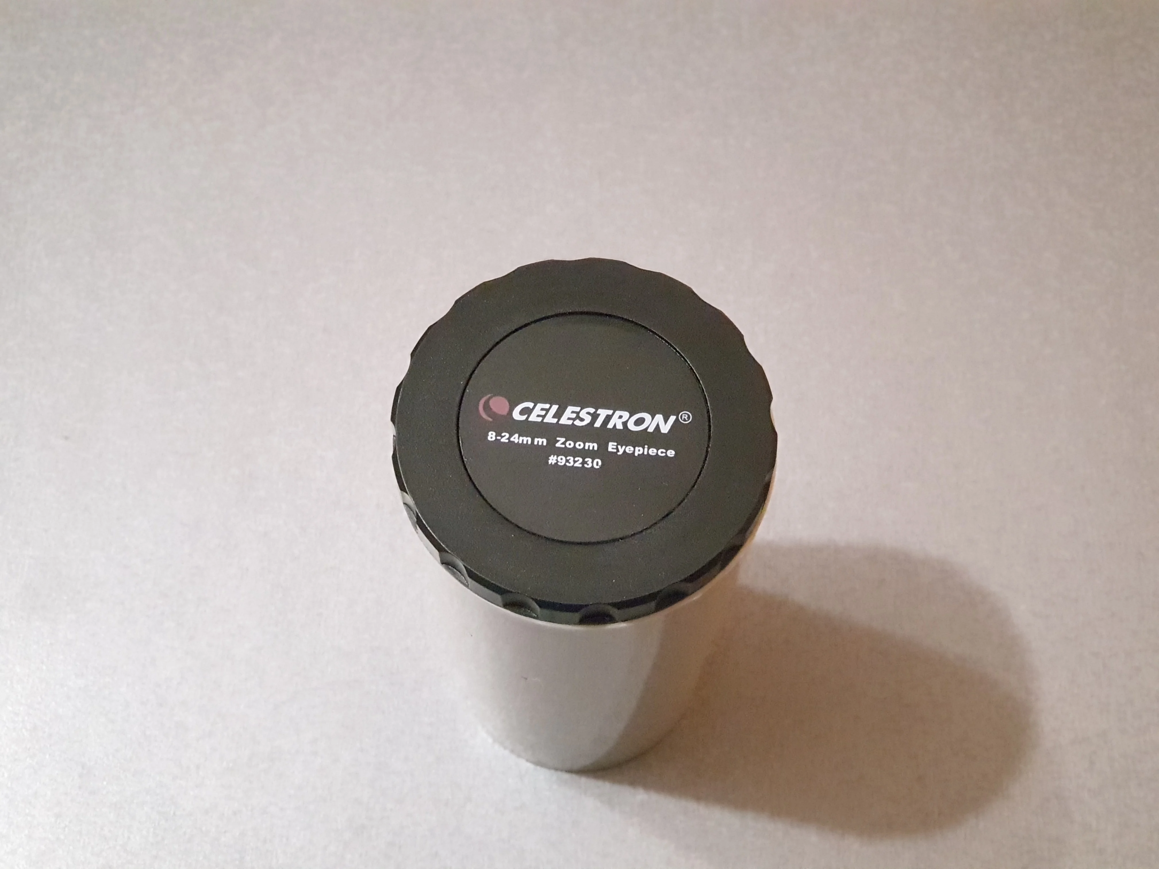 Отличный оригинальный окуляр Celestron, пришёл в фирменной коробочке. Внутри коробки пластиковый защитный тубус с плотной крышкой, надёжно фиксирующей окуляр и предотвращающей его болтание внутри тубуса. Сам окуляр с просветлением зелёного цвета, прорезиненное кольцо зума вращается с некоторым усилием. Под резиновым наглазником есть резьба для T-кольца.