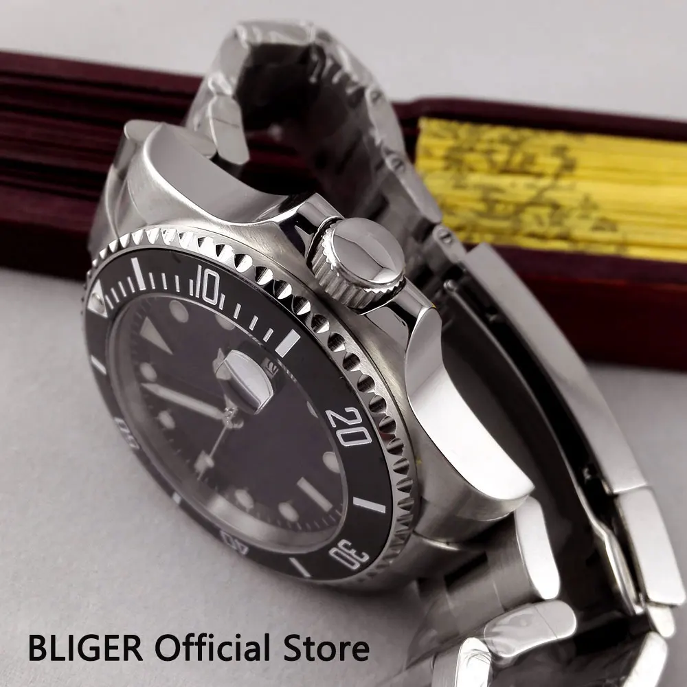 Часы BLIGER мужские стерильные, однотонные черные керамические с сапфировым стеклом и циферблатом, увеличительное стекло для даты, автоматический механизм, 43 мм, B300