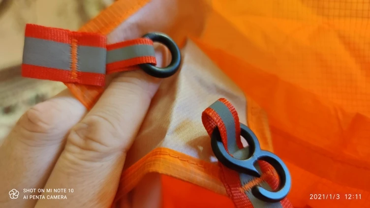 Очень умный дизайн с подкреплением и без люверсов, потому что люверсы порвали бы этот тип ткани. Поэтому многие заботы были включены в дизайн, убедившись, что он супер легкий (215 г) и крепкий. Вы можете прикрепить его к себе.