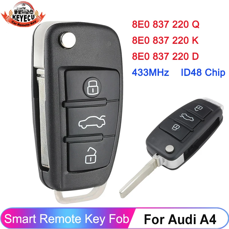 3 кнопки дистанционного флип-ключа 433 МГц Fob для Audi A2 A4 S4 Cabrio Quattro Avant 2005 2006 2007 2008 48 чип 8E0 837 220 Q K D