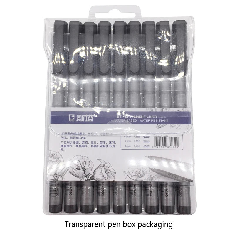 Наконечник ручки 9 размеров: 0,05/0,1/0,2/0,3/0,4/0,5/0,6/0,8/щетка Тип чернил: водяной Этот продукт изготовлен из черных пигментных чернил, мощности тонирования, покрывающей способности, водонепроницаемости и солнечных лучей.